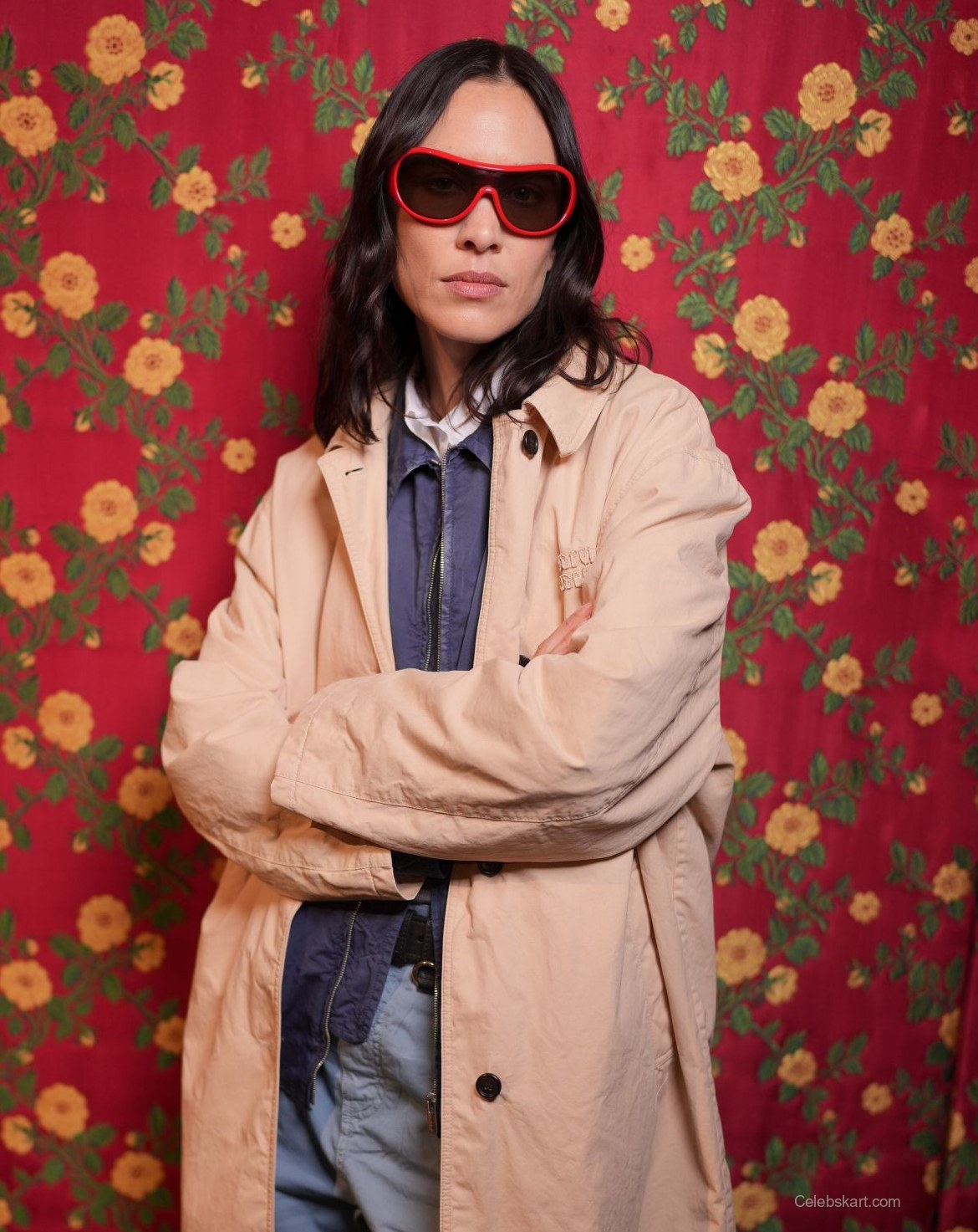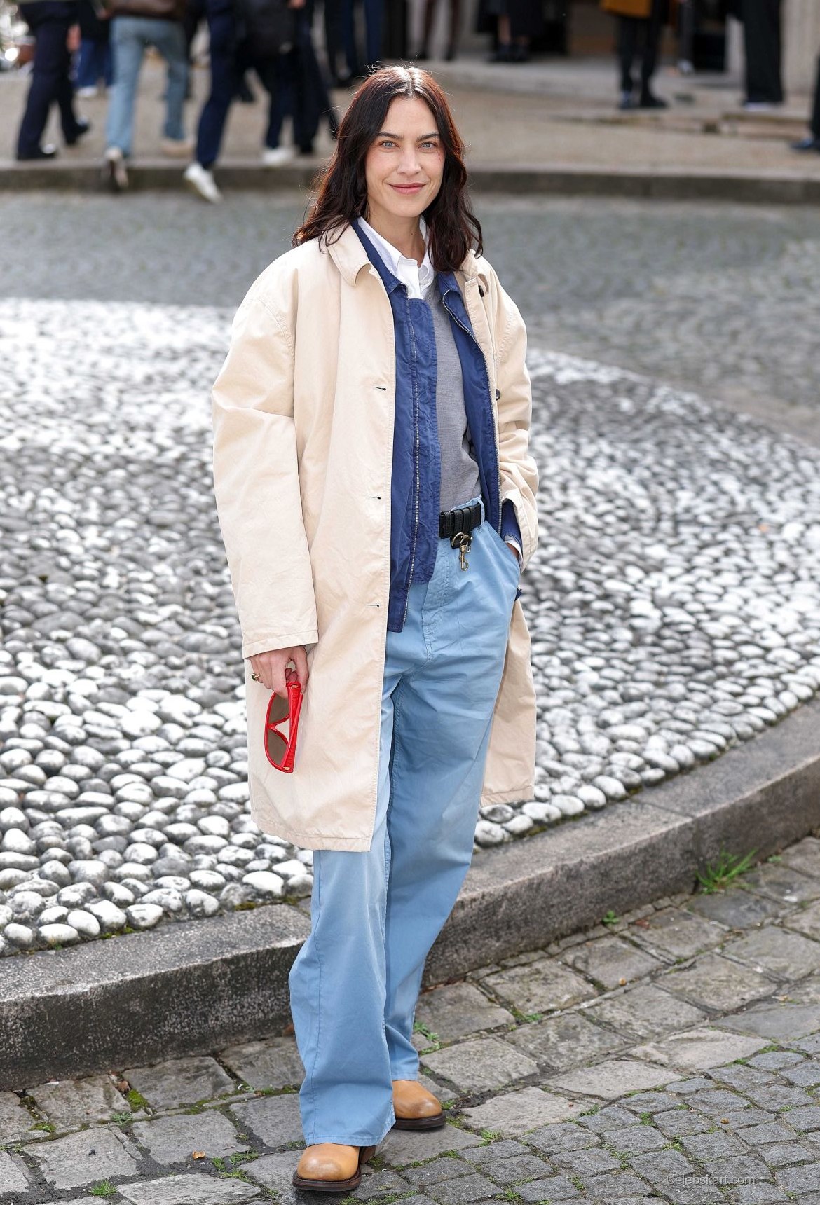 The fashionista wore a beige oversized coat that draped elegantly over a layered outfit. Underneath, she sported a grey sweater set against a navy blue shirt, creating a visually pleasing contrast. Her light blue trousers added a casual touch, while her choice of accessories included striking red sunglasses, enhancing her overall look.