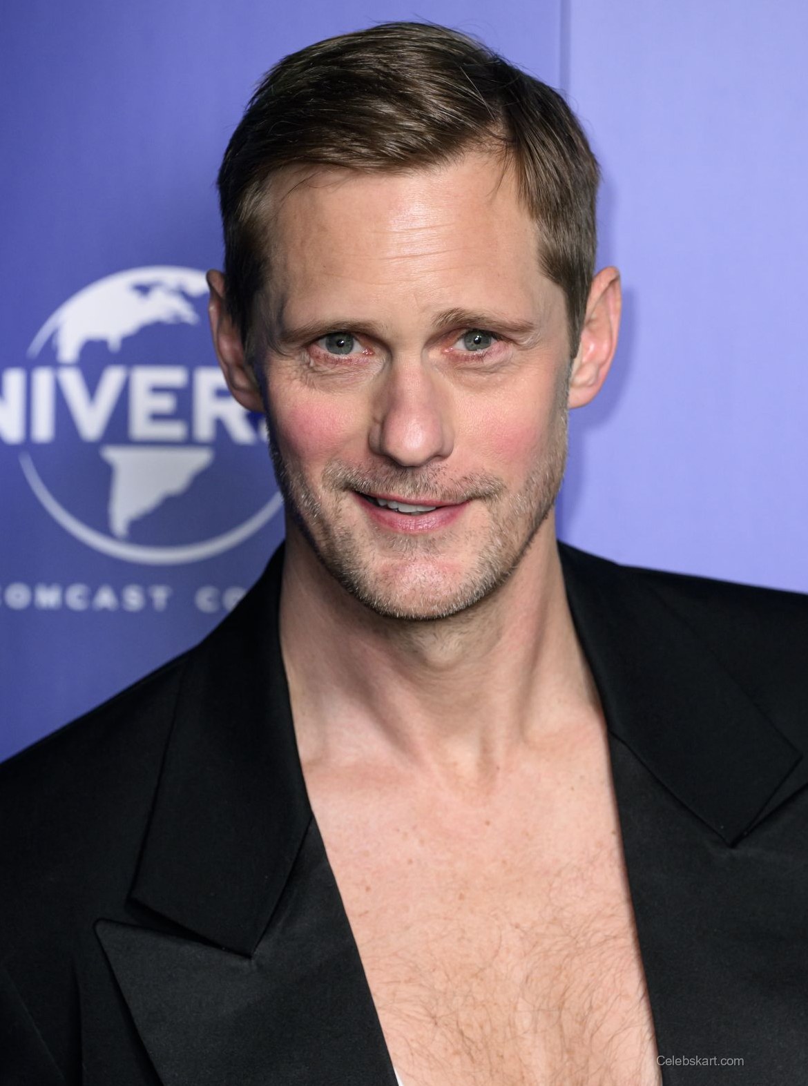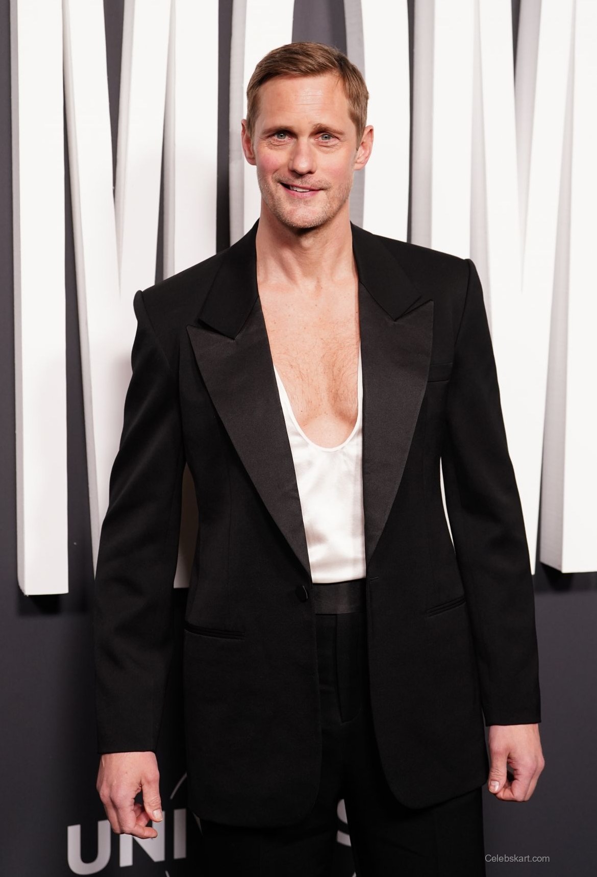 Skarsgard opted for a striking black tuxedo that featured a distinctively low-cut white shirt beneath a structured black jacket. The ensemble was perfectly tailored, emphasizing his tall frame. His trousers were sleek and fitted, complementing the overall elegance of his look. The black shoes he wore added polish to his appearance, providing a seamless finish to the outfit. This combination of elements created a balanced and sophisticated silhouette.