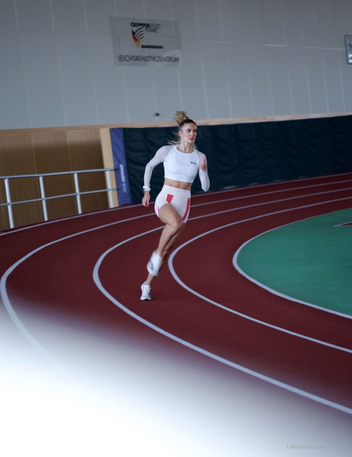 The combination of white and red hues in Alica’s outfit makes it visually striking against the backdrop of the indoor track. The color scheme not only pops but also complements the athlete's features, making her an eye-catching figure on and off the field. Alica Schmidt's choice of a fitted silhouette allows for a liberated range of movement, crucial for both comfort and performance. Her style integrates athletic function with aesthetics, inspiring trends in the world of sportswear.