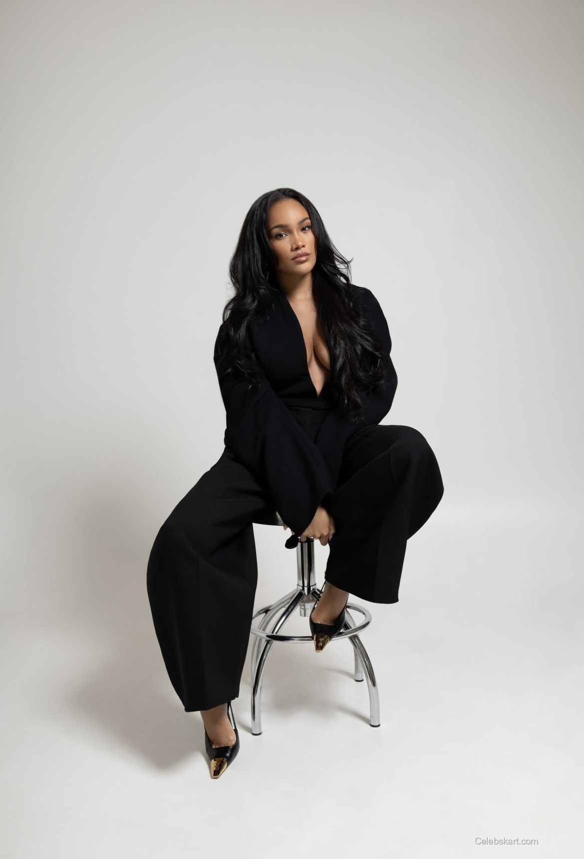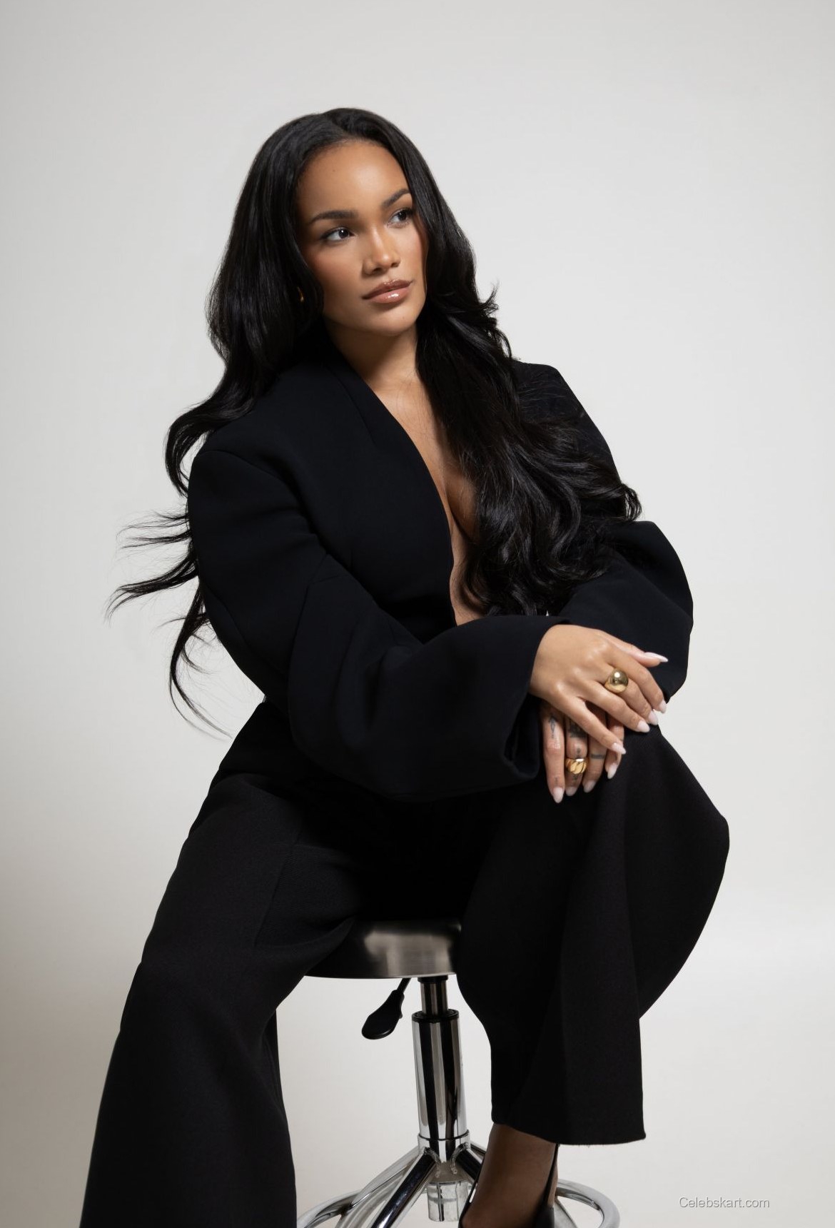 ALLYIAH’s pose exudes confidence and poise as she leans forward slightly, one hand resting under her chin. Her long hair cascades elegantly over her shoulders, enhancing the overall allure. The shoot's lighting casts a soft glow, highlighting the contours of her face and the intricate details of her accessories. One particular shot captures her sitting with one leg crossed over the other, showcasing polished footwear that perfectly complements the outfit. For more details on her styling choices, explore ALLYIAH's outfit inspirations further.