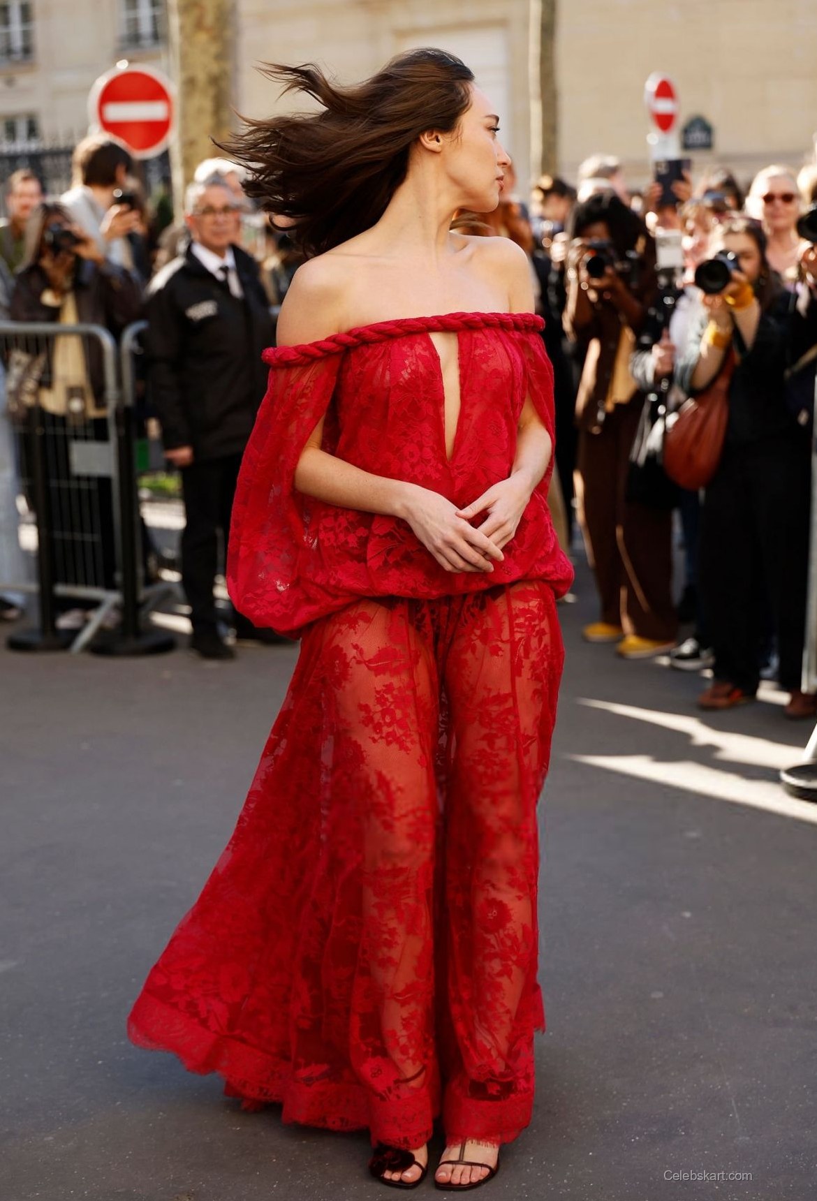 As Alycia posed for photographs, the natural light illuminated the gown, showcasing its luminous fabric as it caught the sun’s rays. Her long hair cascaded over her shoulders in soft waves, framing her face beautifully. In one moment, she turned her head slightly, showcasing her profile while holding a confident gaze towards the camera. The elegant setting, with hints of Parisian architecture in the background, created a stunning contrast to her fiery outfit.