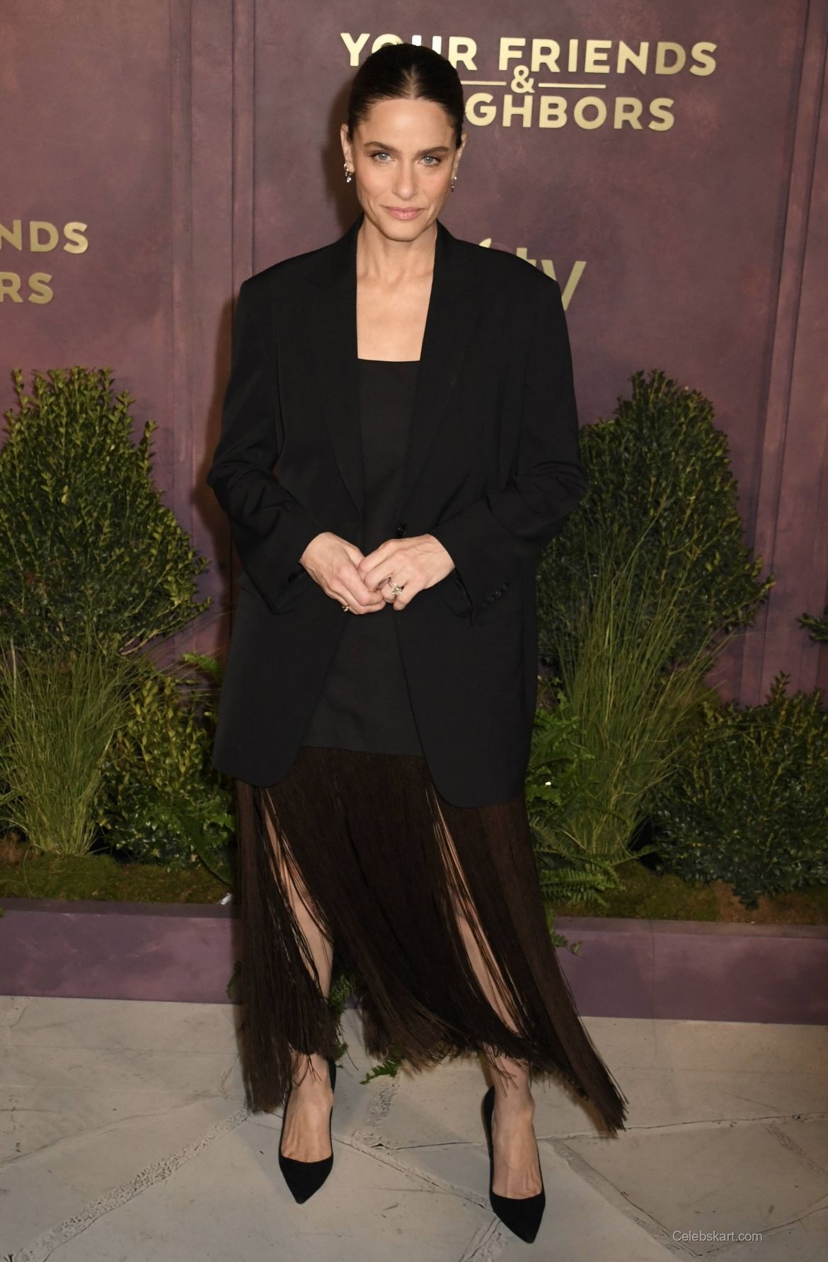 This outfit is a perfect example of the balance between modern style and classic elegance. The combination of tailored pieces and unique textures demonstrates Amanda's ability to stay on-trend while making thoughtful fashion choices. The fringed skirt not only adds movement but also contrasts beautifully with the structured blazer. For those inspired by her look, check out more from Amanda Peet or explore details from the Your Friends & Neighbors event.