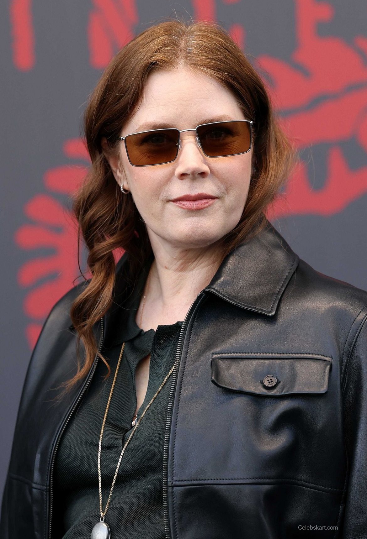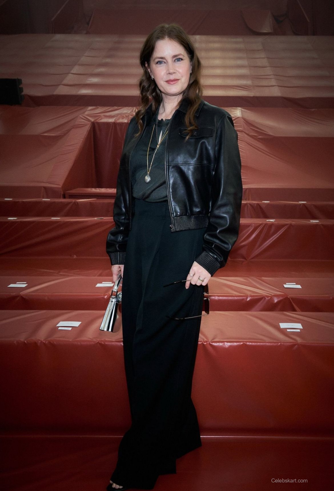 The outfit was predominantly black, featuring a leather bomber jacket paired with a sophisticated, flowing black skirt. This combination emphasized her silhouette while maintaining a contemporary edge. Adams accessorized her look with a silver necklace, adding a touch of elegance to her outfit while keeping it understated. She carried a textured handbag that complemented her attire beautifully. The overall look was well-coordinated, making her stand out among other attendees.