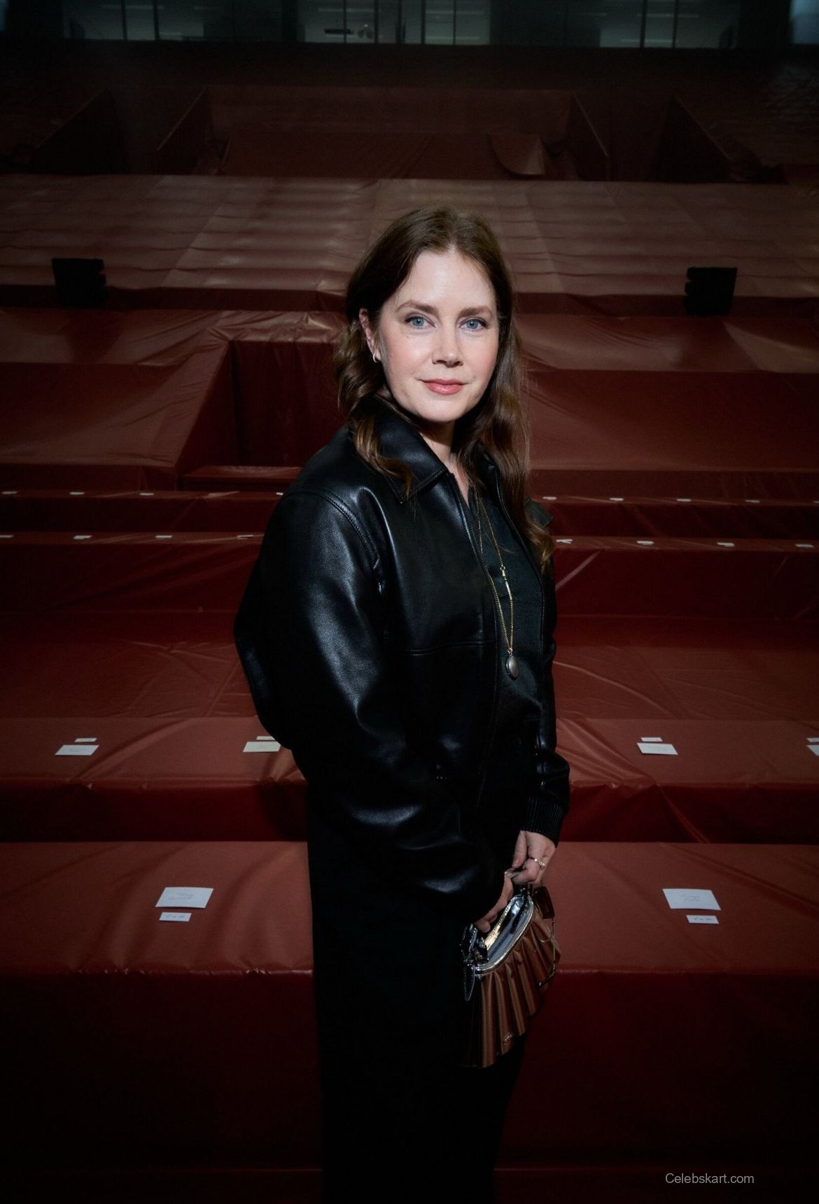 As she posed for photographs, Adams displayed an array of confident expressions, showcasing her comfort in the ensemble. Standing on the crimson seating area of the fashion show, her choice of sunglasses added a glamorous touch, elevating her already impressive look. The dim lighting of the venue provided a dramatic backdrop, further enhancing the visual appeal of her appearance.