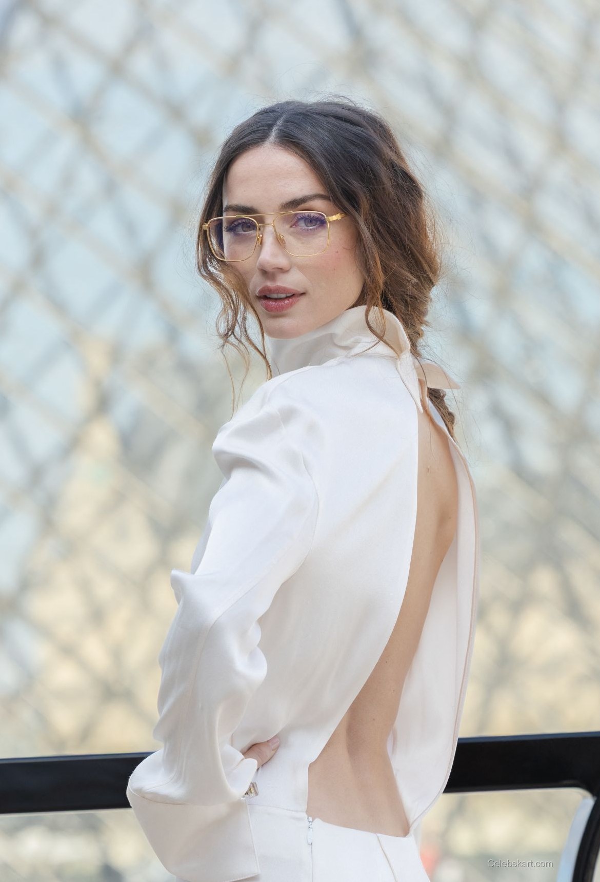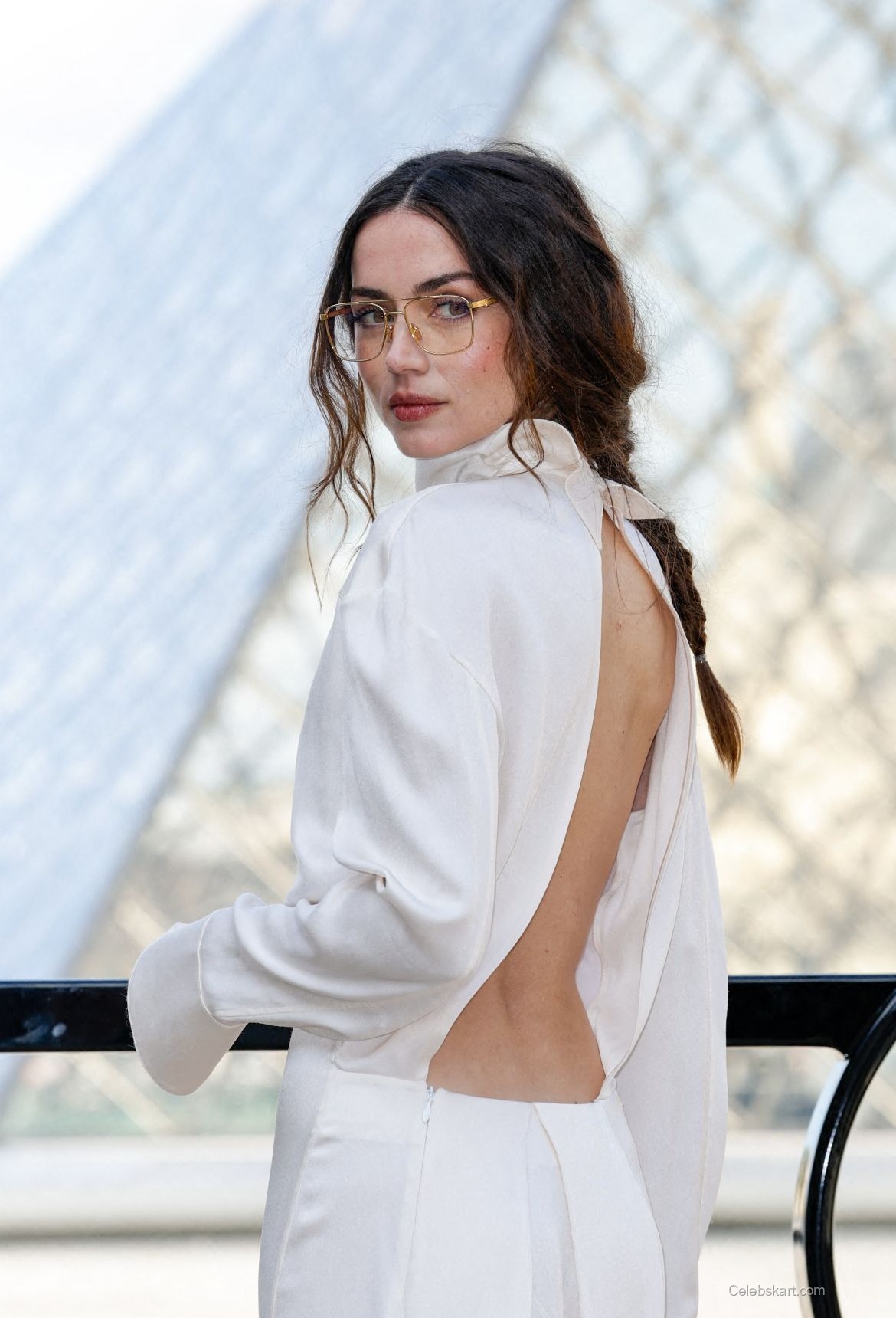 In one captivating moment, Ana was seen glancing back at the camera, her hair flowing gently in the breeze. The sunlight highlighted her natural beauty, as she wore understated makeup that allowed her features to shine. Additionally, her stylish glasses with golden frames added a unique touch to her ensemble, showcasing her bold yet elegant personality. This effortless blend of comfort and style stood out among the sea of fashion elite at the event.