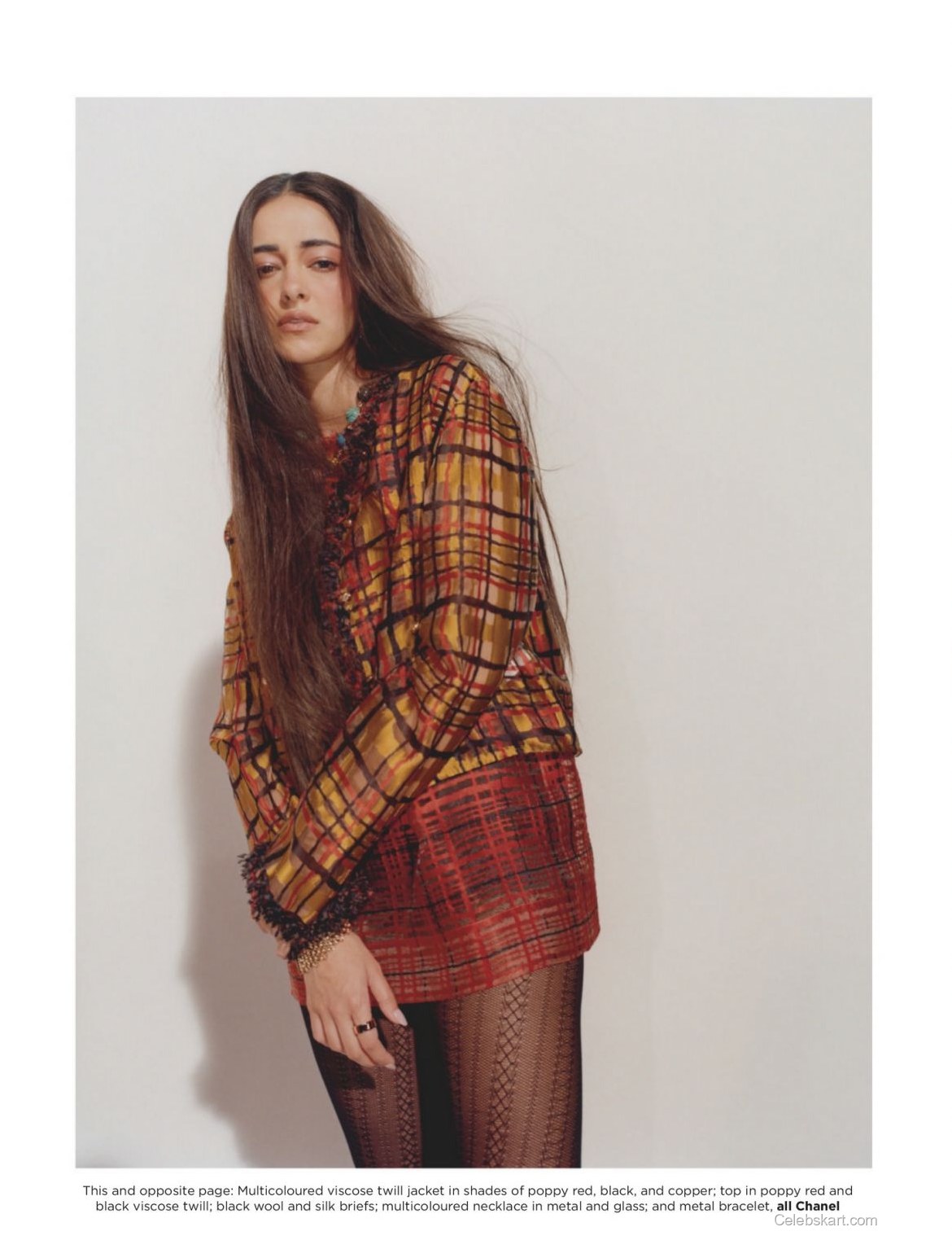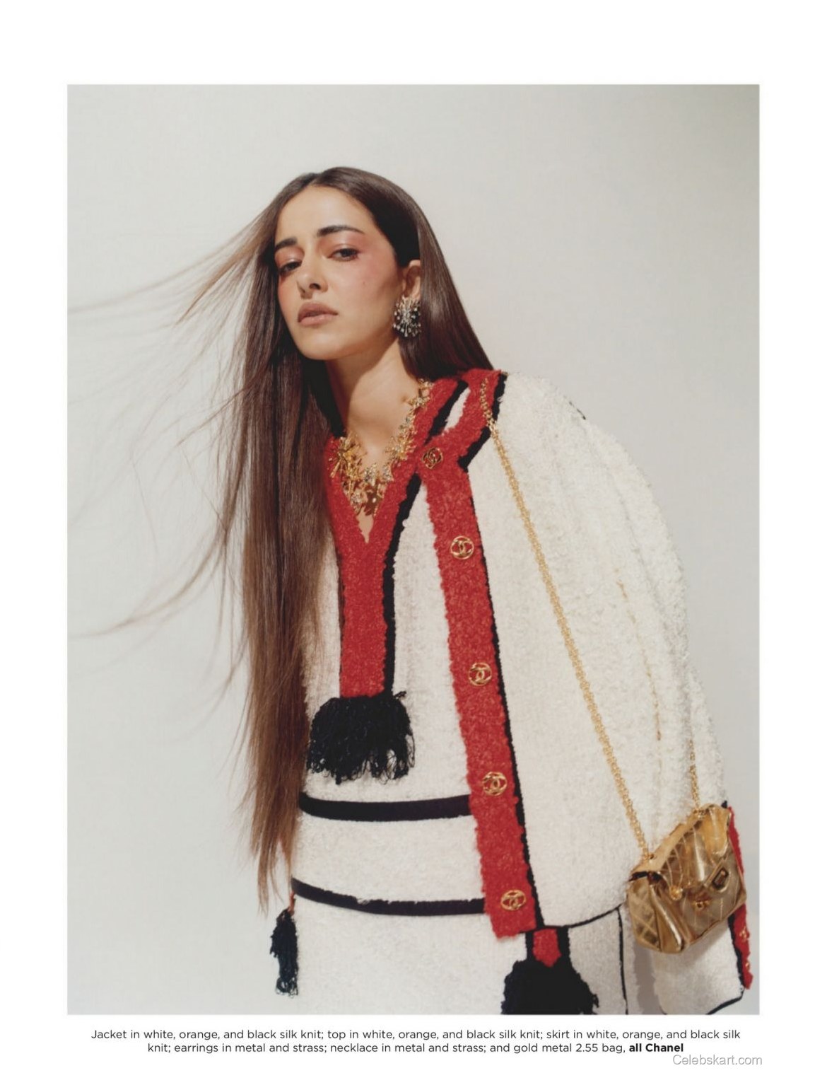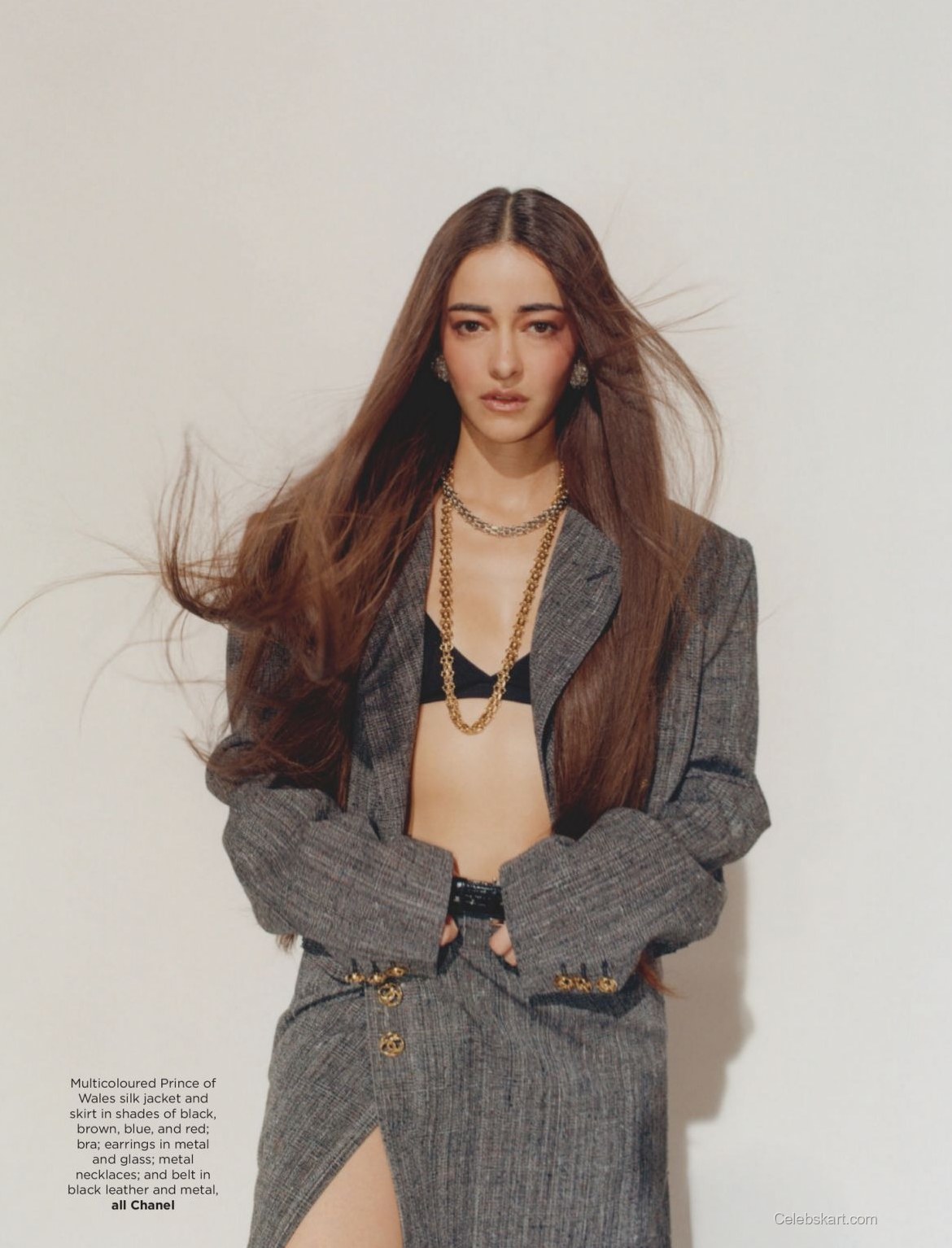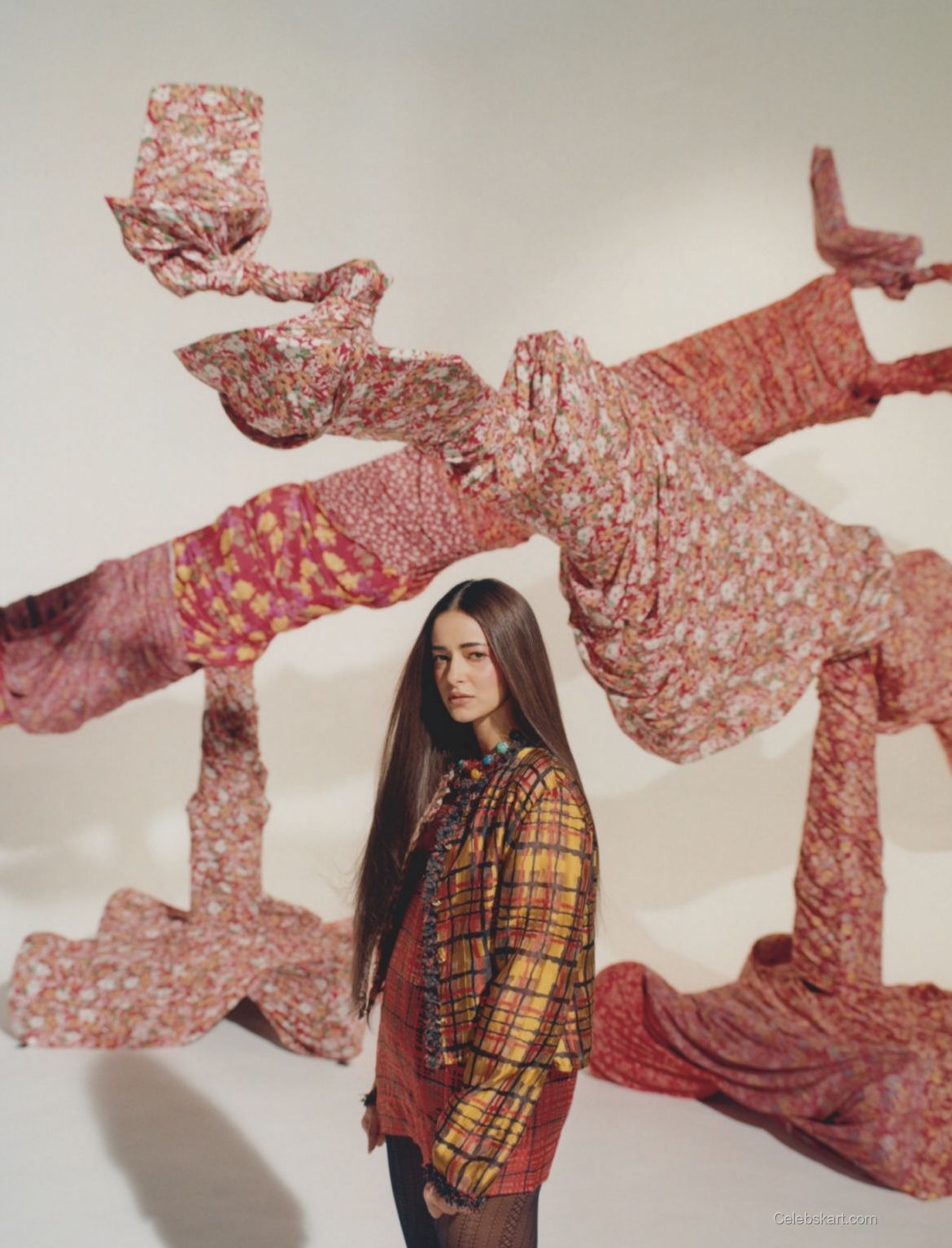 A kaleidoscope of colors defines Ananya's outfit, featuring a vibrant combination of hues and patterns. She commands attention in a multicolored ensemble that pairs a chic plaid jacket with a flowing skirt. The intricate detailing plays with the senses, providing an artful juxtaposition to the bold backdrop. The rich textures and patterns highlight her ability to blend classic and modern styles perfectly. The striking choice of accessories completes her look, including statement earrings that elevate her entire outfit.