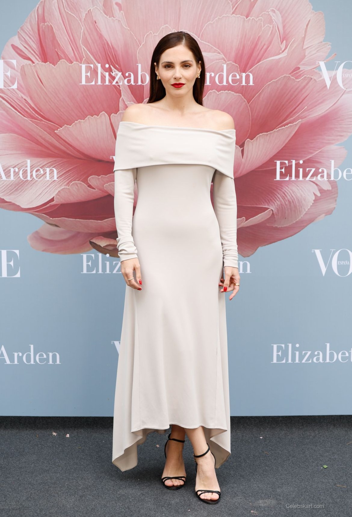Andrea Duro attended the launch of Elizabeth Arden's new Eternal Aura fragrance in collaboration with Vogue in Madrid. She wore a beige off-shoulder dress that flowed elegantly to the floor. The dress featured long sleeves and a fitted silhouette that complemented her figure. Andrea styled her look with bold red lipstick and subtle earrings, providing a refined touch to her outfit. The event showcased her fashion choice in a chic urban setting, enhancing the fragrance launch atmosphere.