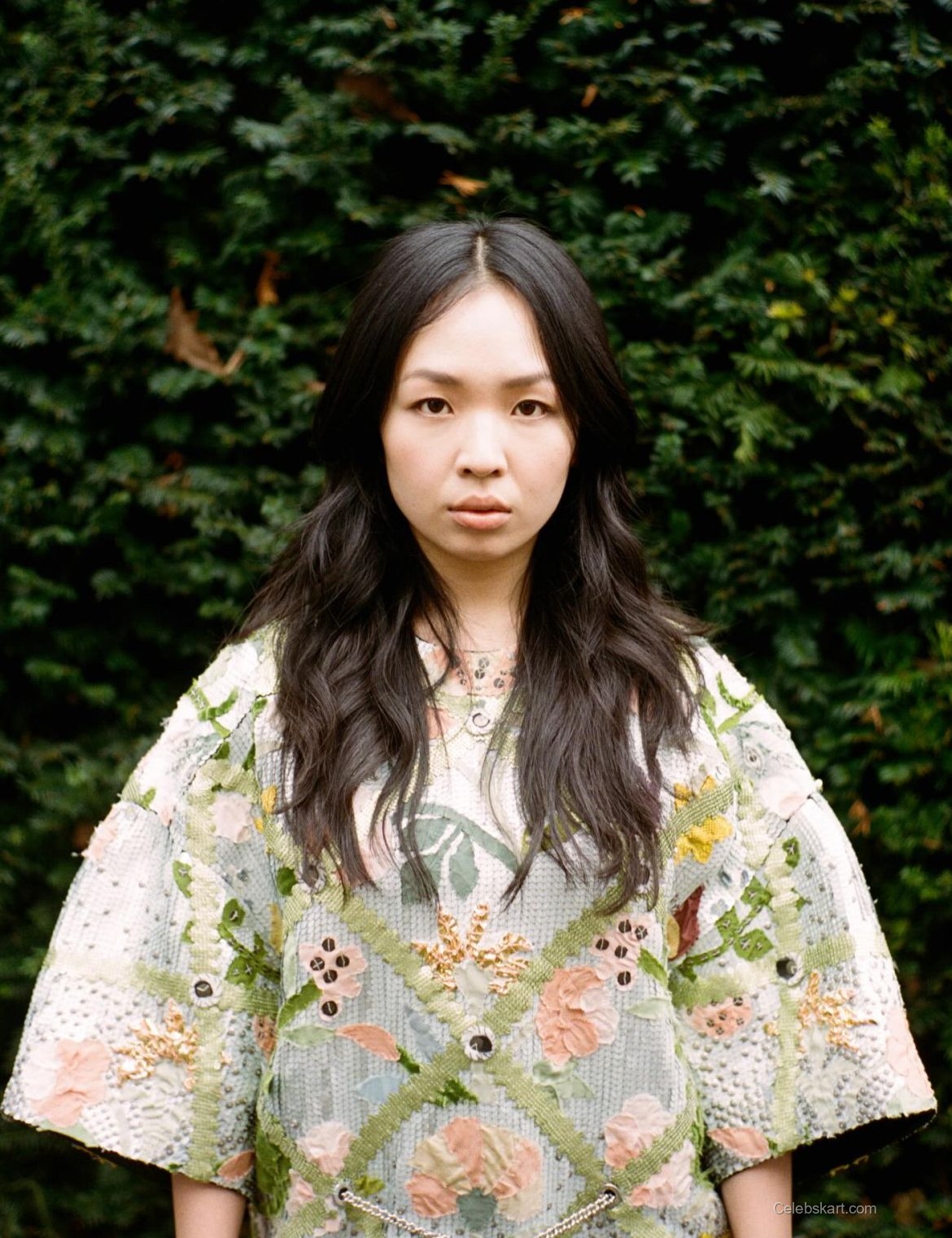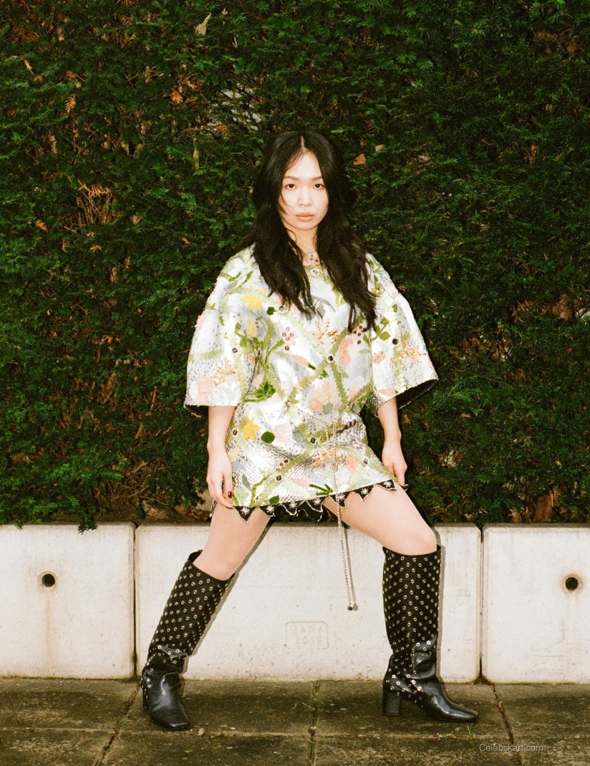 The style includes accessories that enhance the floral theme of her outfit. The knee-high boots stand out with their unique embellishments. Long chains are draped across the dress, adding dimension to the ensemble. The combination of floral patterns and bold accessories makes for a noteworthy fashion presentation.