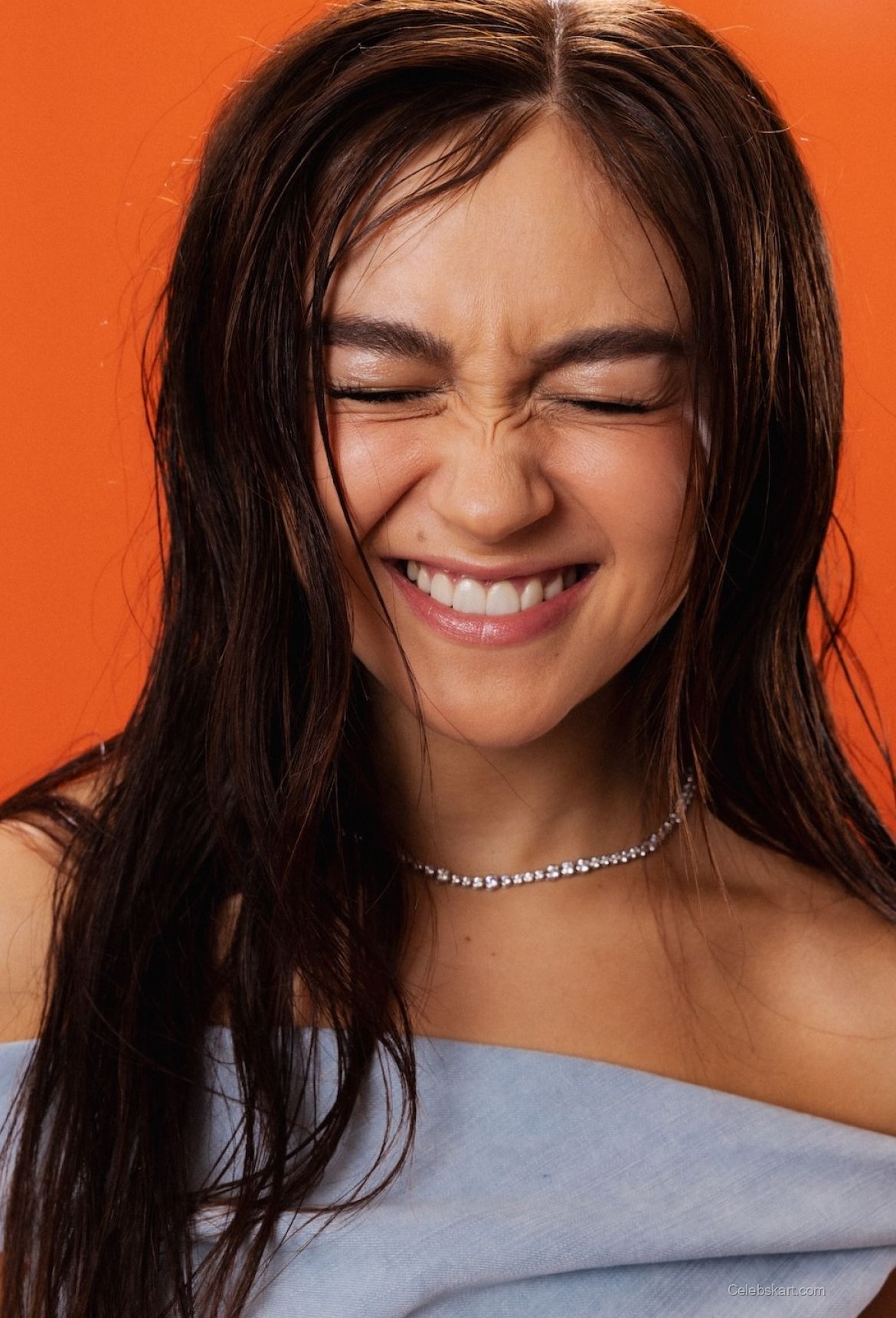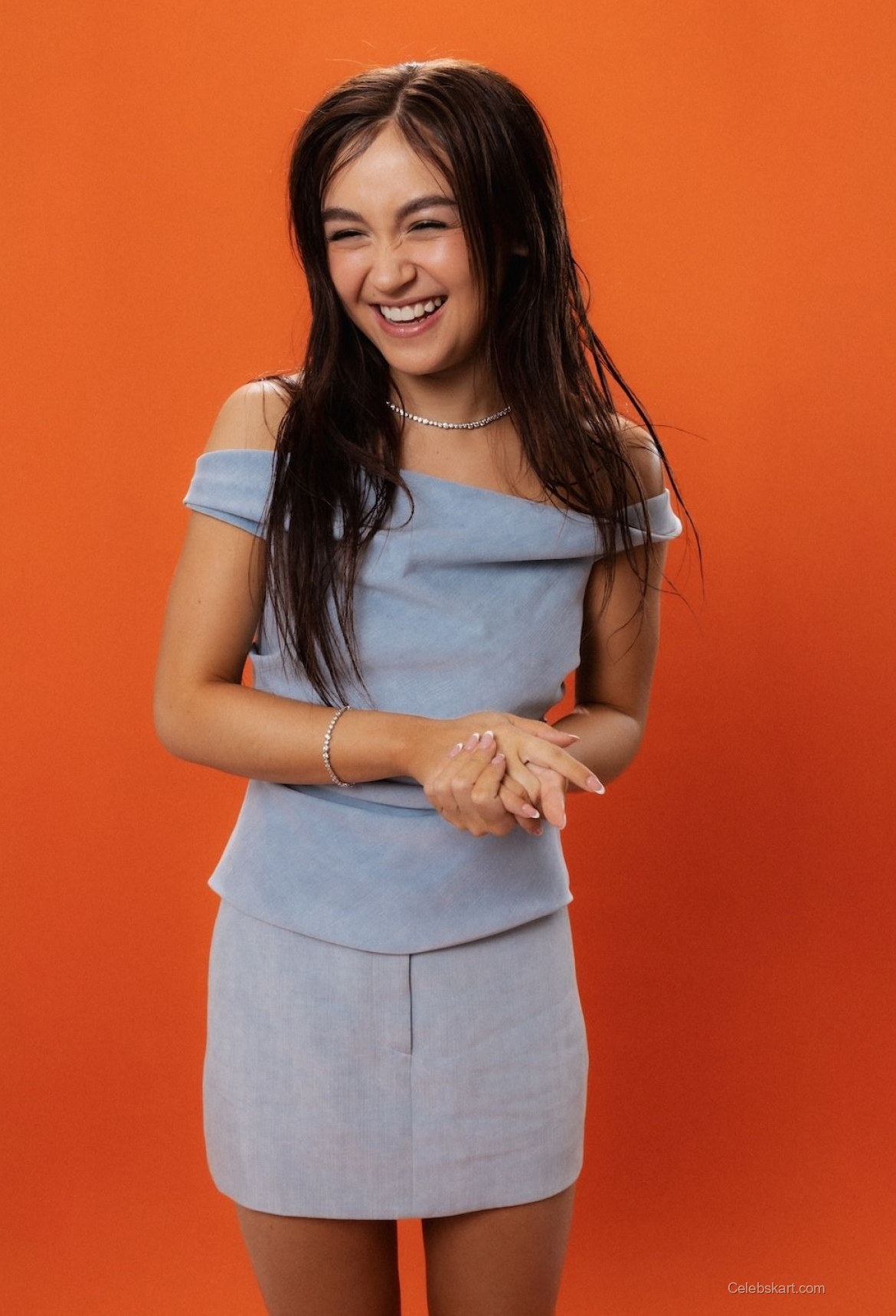 In this shoot, Anna dons a charming light blue off-shoulder top paired with a matching skirt. The soft fabric gives her a relaxed yet polished appearance. The color choice enhances her youthful glow, making her stand out brilliantly against the warm orange background. The outfit is completed with a delicate necklace that adds just the right touch of sparkle, perfectly showcasing her styling choices. See more Anna Cathcart photos that feature similar trendy outfits, capturing her distinct fashion sense.