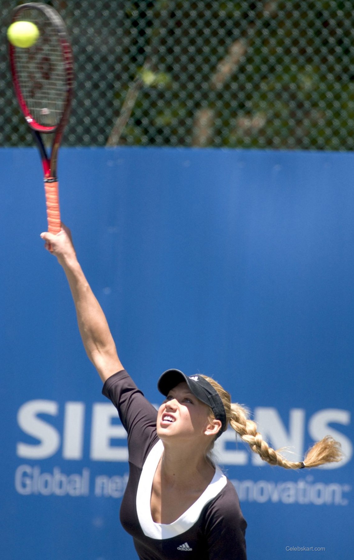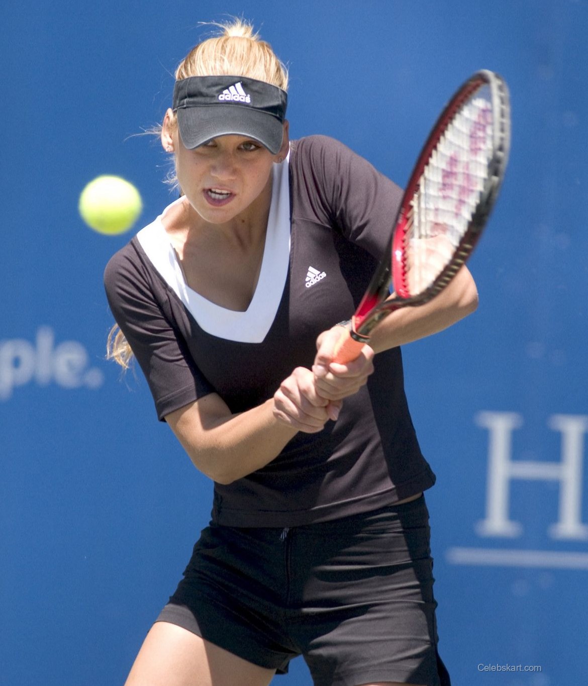 Anna donned a stylish black top paired with matching shorts, designed specifically for optimal movement on the court. The top featured a wide white V-neck outline, offering a striking contrast against the dark fabric. This choice of attire was paired with sleek white tennis shoes adorned with black stripes, providing both comfort and support. Such details in her outfit highlighted Kournikova's blend of athleticism and fashion sensibility, making her stand out at the event. You can find more images of Anna Kournikova's tennis outfits here.