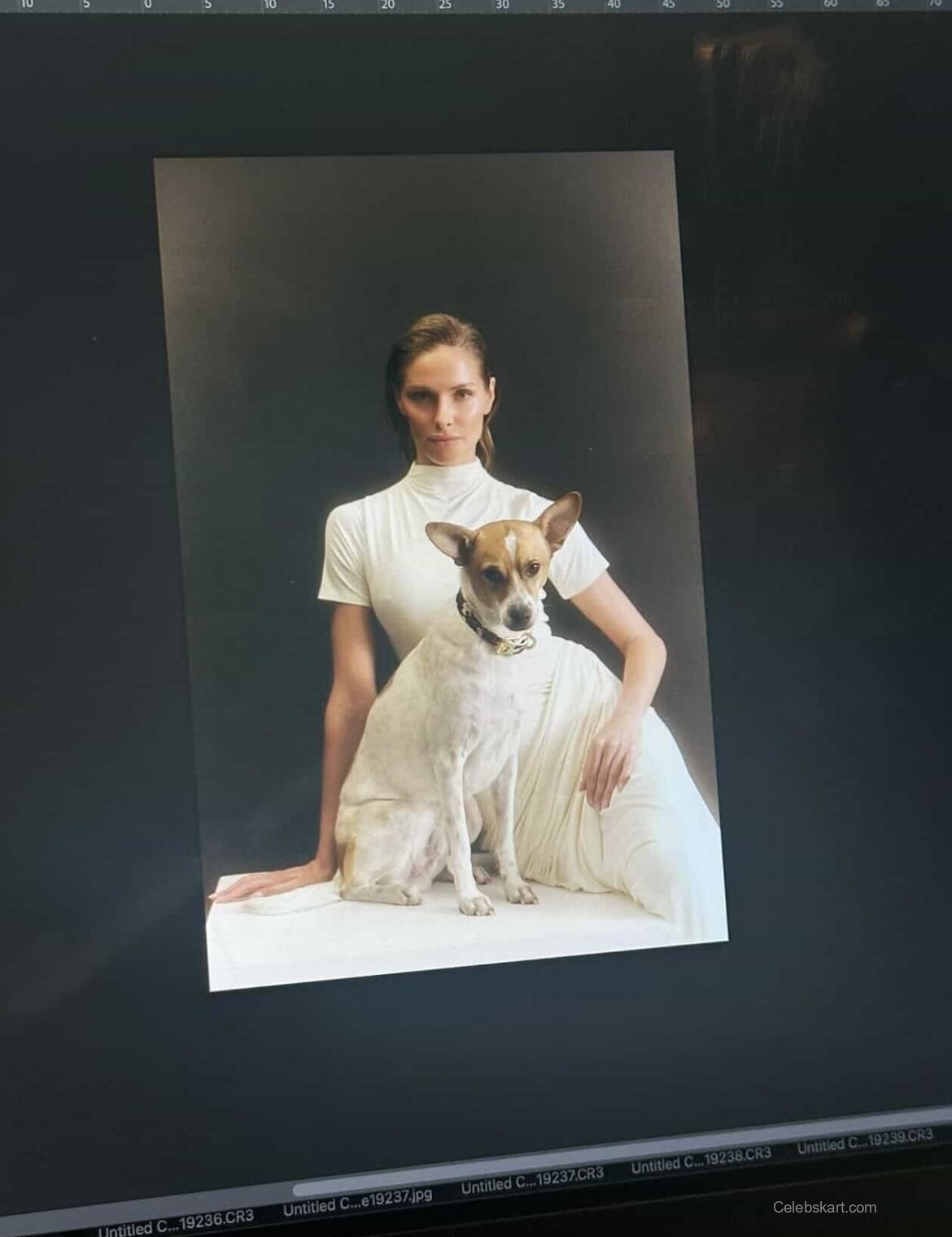 As she interacts with her surroundings, her expressions convey a sense of joy and self-assuredness. In another image, she is seen holding her pet dog, a moment that showcases a different side of her personality. This blend of chic fashion with moments of warmth makes her a relatable icon.
