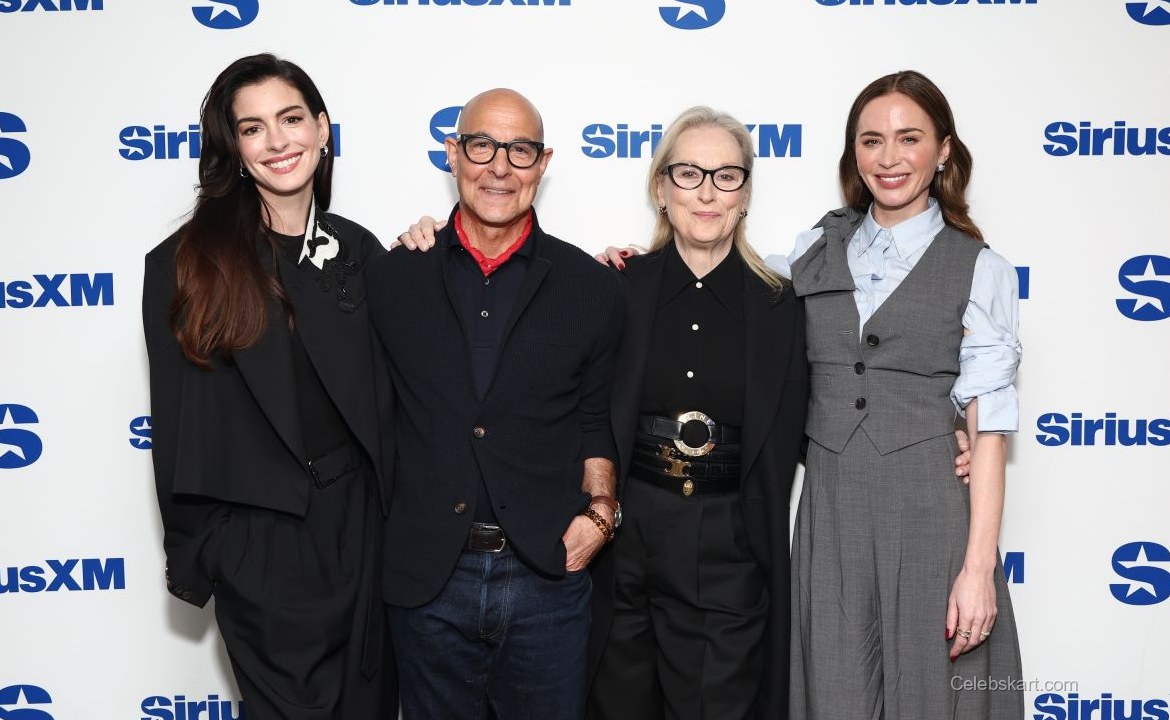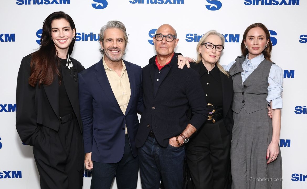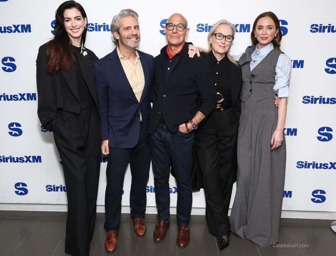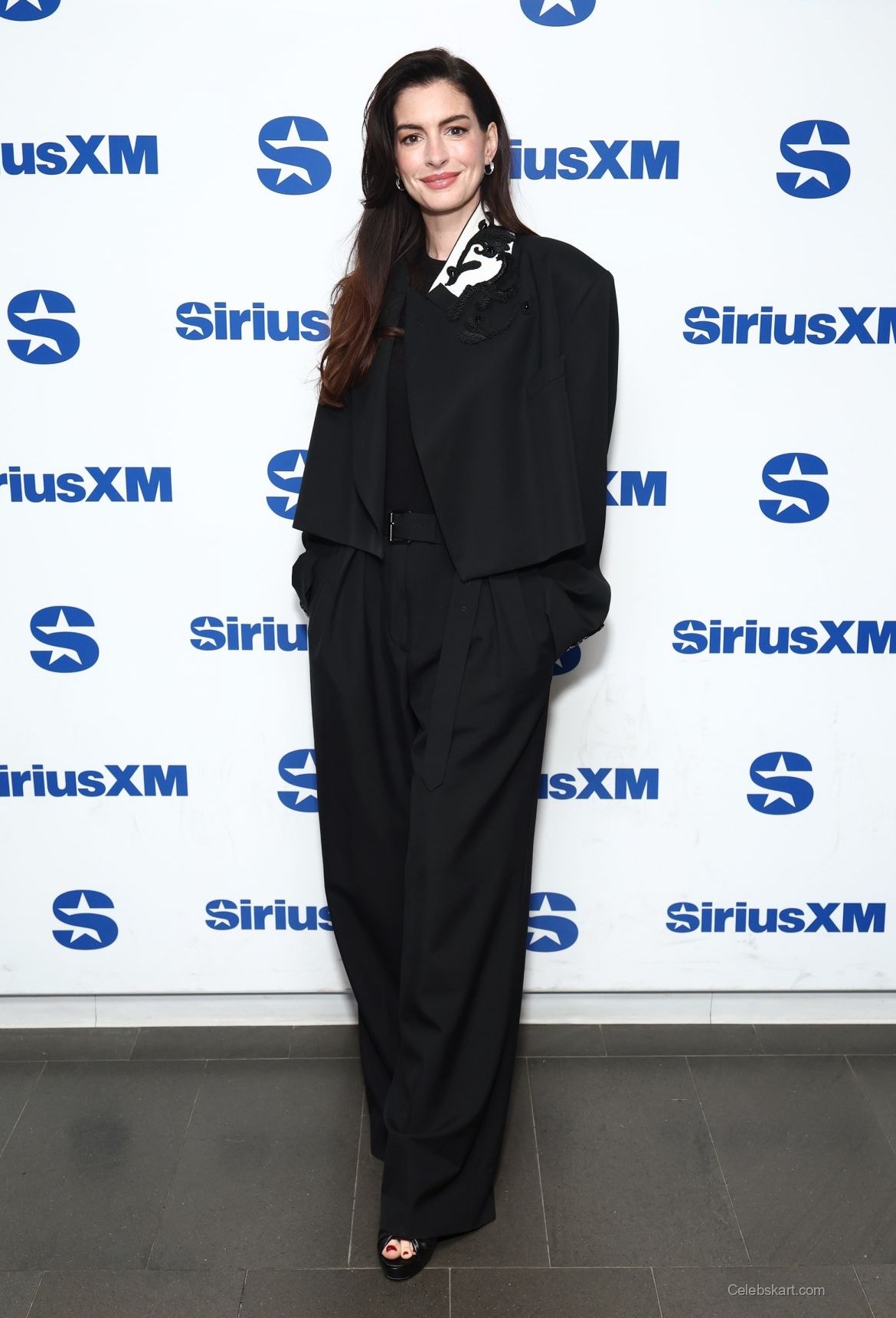 During her visit to SiriusXM Studios, Anne Hathaway presented a stylish black outfit. The tailored jacket and flowing trousers created a sleek silhouette that caught the eye. The unique design featured a striking motif on the jacket that added an element of interest. The monochromatic color scheme contributed to the sophisticated vibe of her look.