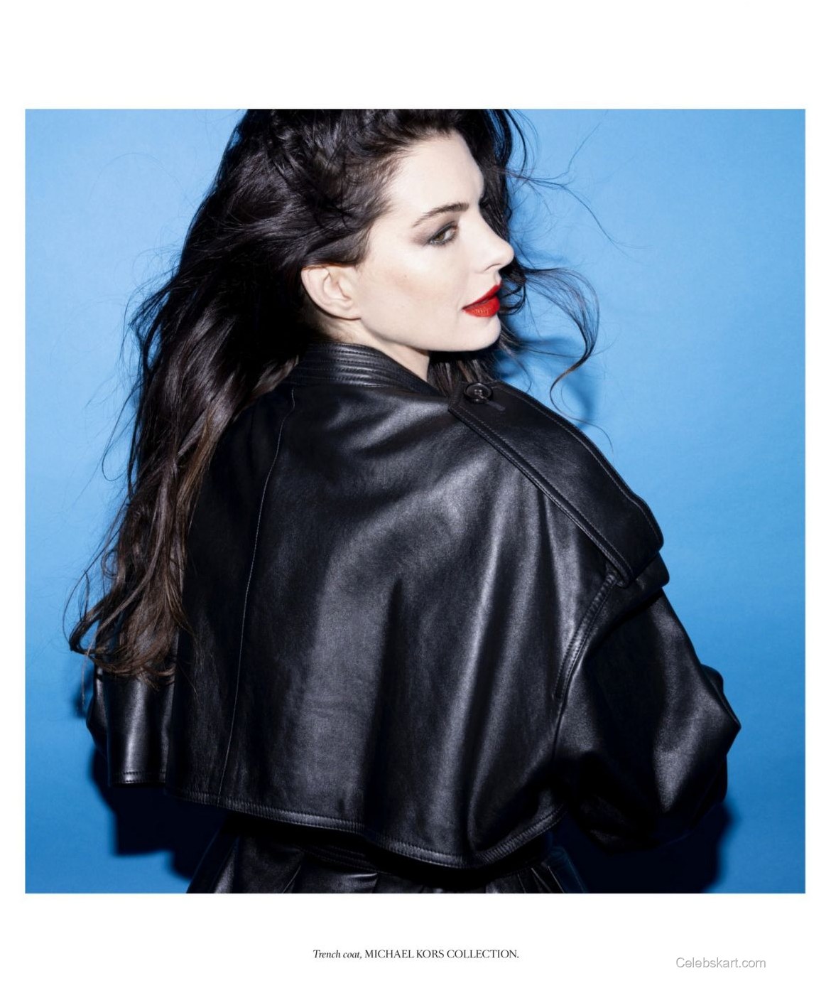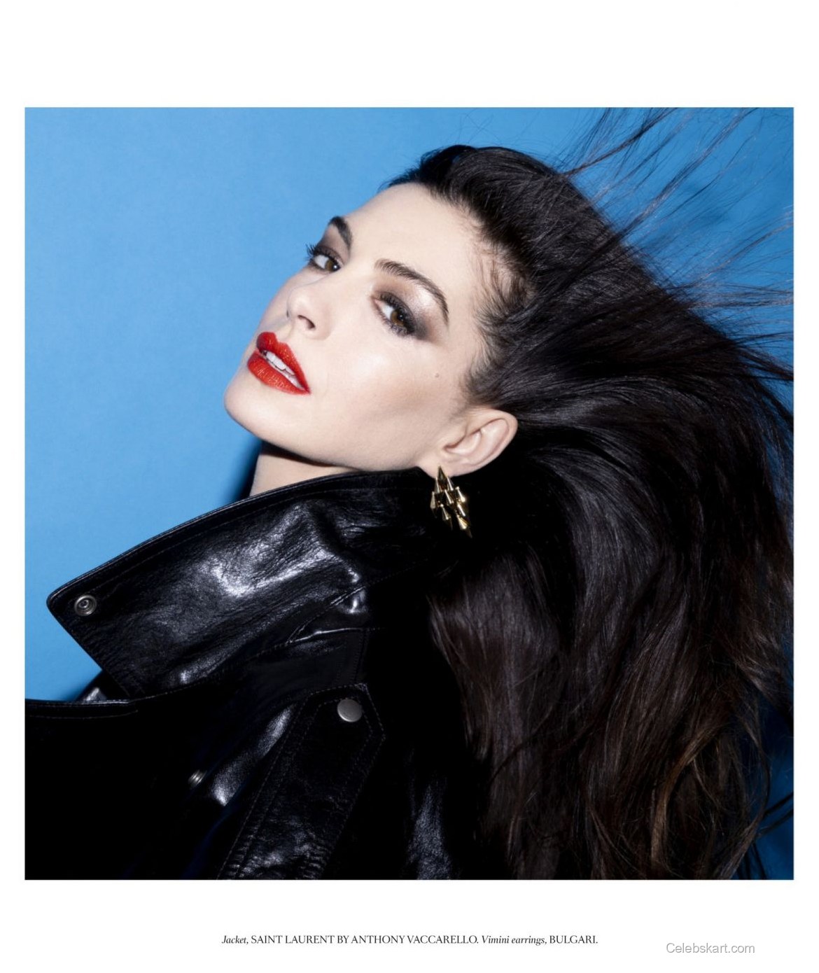 In the photo shoot, Anne Hathaway poses against a vibrant blue background, making her outfit pop even more. She is seen confidently raising her arms, which highlights the intricate details of her ensemble. The lighting captures the glossy finish of her black waistcoat, paired with soft waves cascading around her face. This playful energy adds to her magnetic presence, captivating the camera.