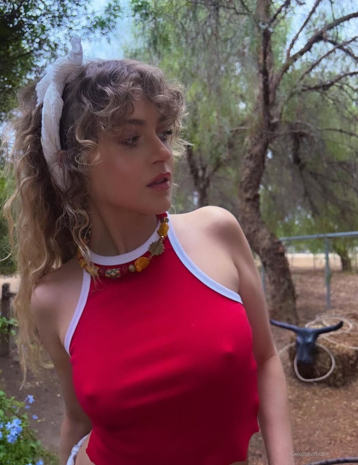 The vibrant red top features a simple yet stylish design, enhancing Anne's natural beauty. The matching denim shorts add a playful touch, with frayed edges and a laid-back fit. The way the fabric moves allows Anne the freedom to express her style, making this ensemble perfect for casual outings or summer hangs. To see more Anne Winters summer outfits, check out her recent fashion highlights.