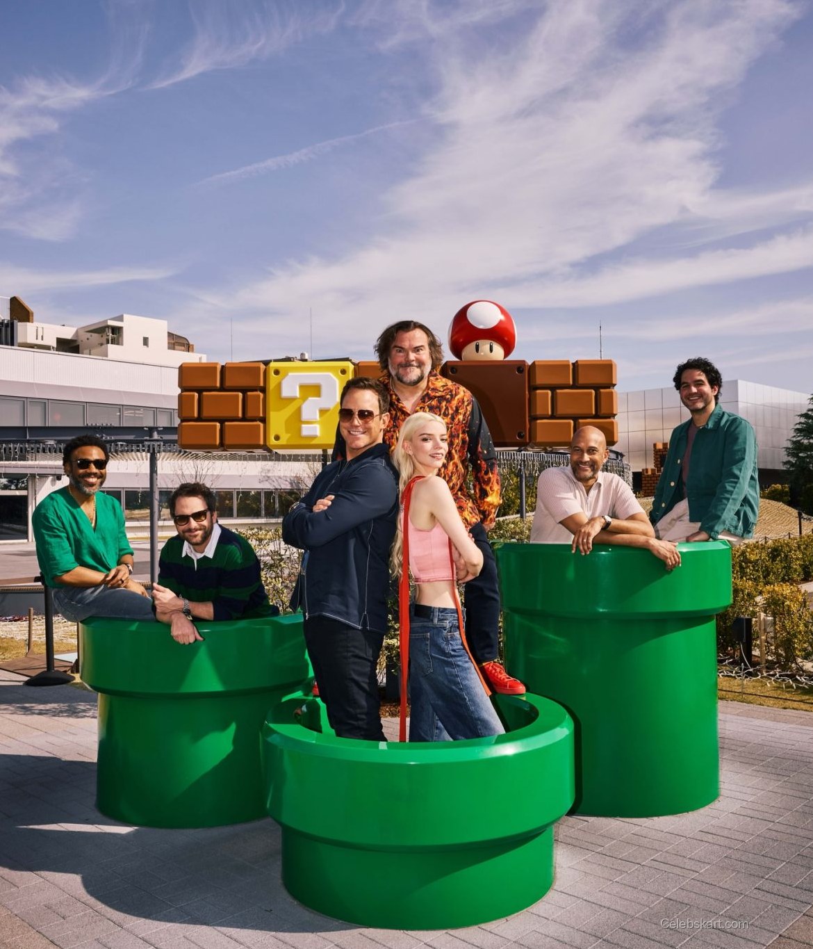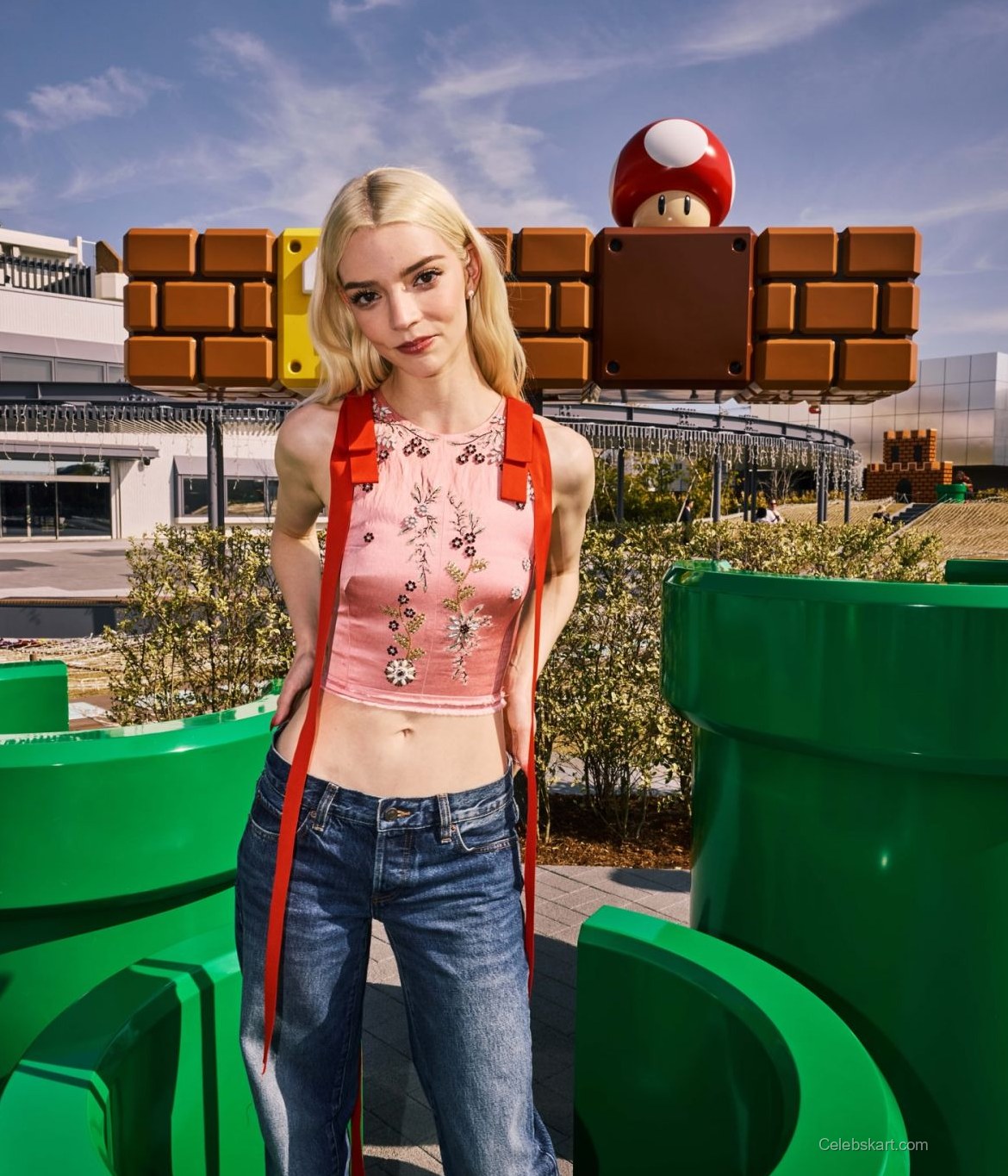 With her hair cascading in soft waves, Anya exuded a carefree charm as she engaged with fans and fellow cast members. She posed gracefully beside iconic elements from the Super Mario franchise, including large green pipes and colorful question blocks. One notable moment featured her leaning against a green pipe, smiling while showcasing her playful side. During another interaction, she chatted animatedly with her co-stars, radiating positivity amidst the lively backdrop of the event.