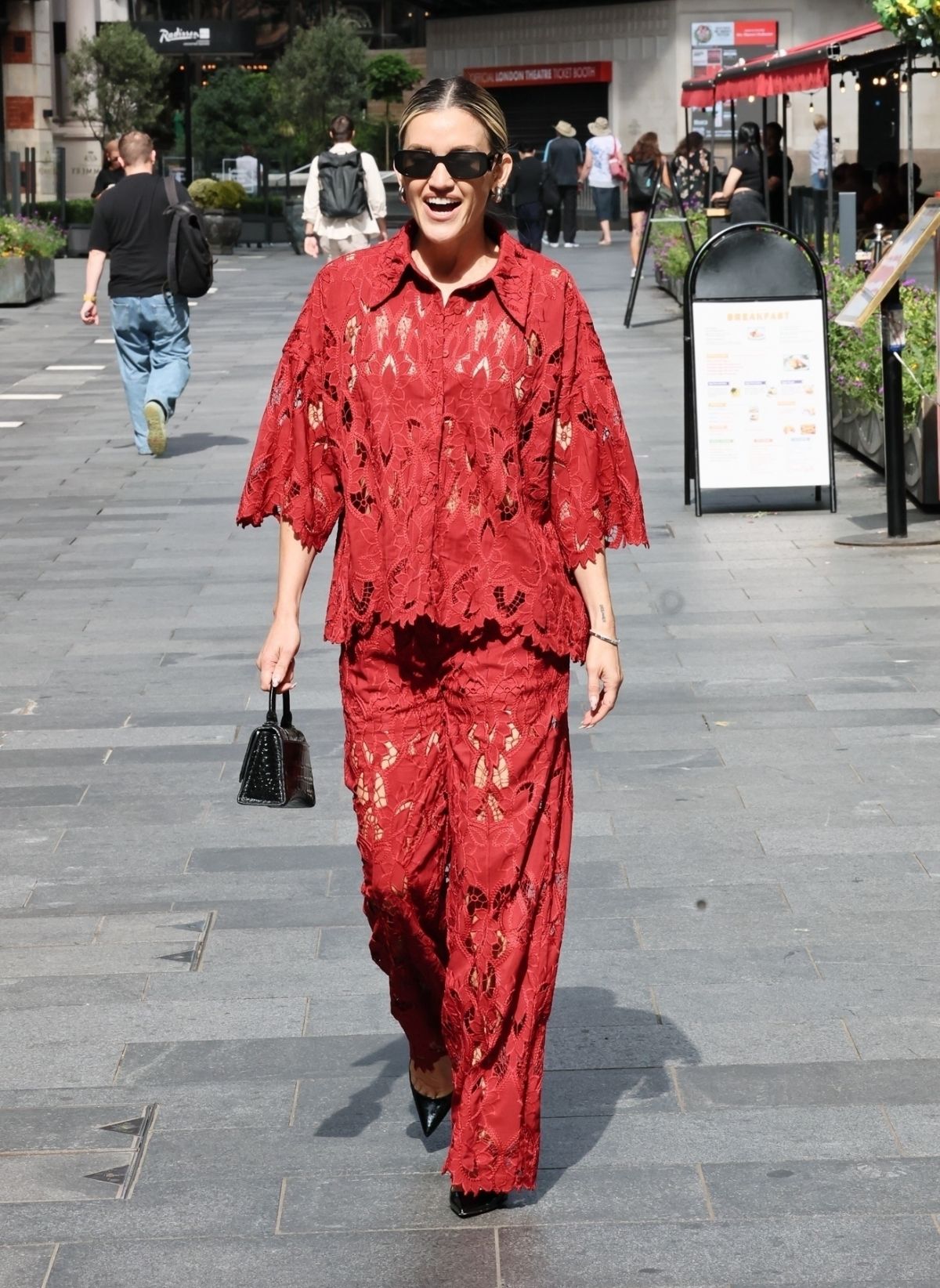 Ashley Roberts in red leaves Heart Radio, June 2025