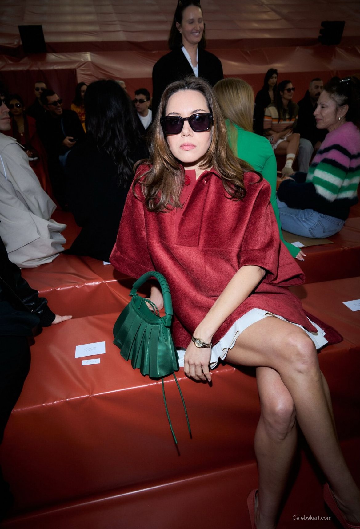 The standout piece of Aubrey's ensemble was a bold red poncho, which brought warmth to the chilly Parisian air. Underneath, she sported a crisp, white pleated skirt that contrasted beautifully with the deep color of her outerwear. Completing the look were stylish red heels with colorful straps that added an unexpected touch. In her hand, Aubrey carried a green pleated handbag, creating a striking visual contrast.