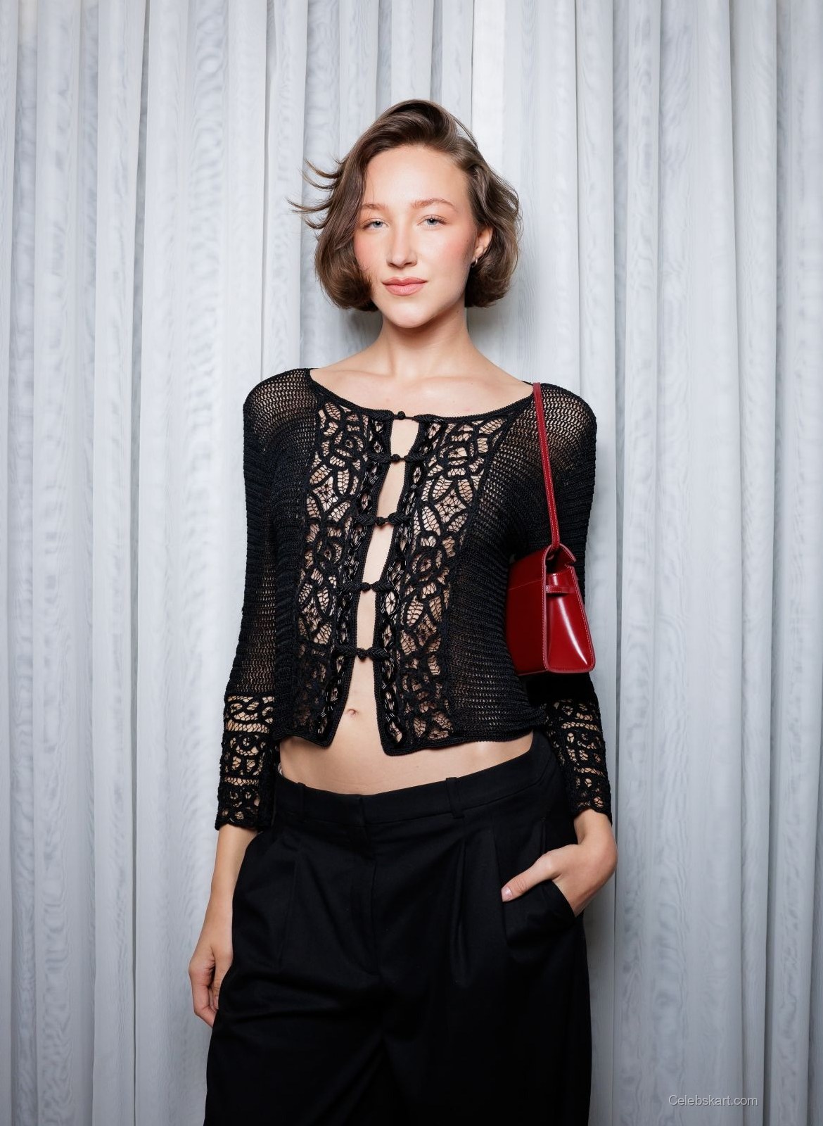 Ava was spotted striking various poses, showcasing the details of her outfit against a beautifully draped backdrop of soft fabrics. She walked confidently, her hair styled in soft waves, perfectly framing her face. The red bag she carried added a pop of color, creating a stylish contrast to her black attire. While speaking with guests, her charisma and poise were palpable, making her look not only fashionable but also approachable.