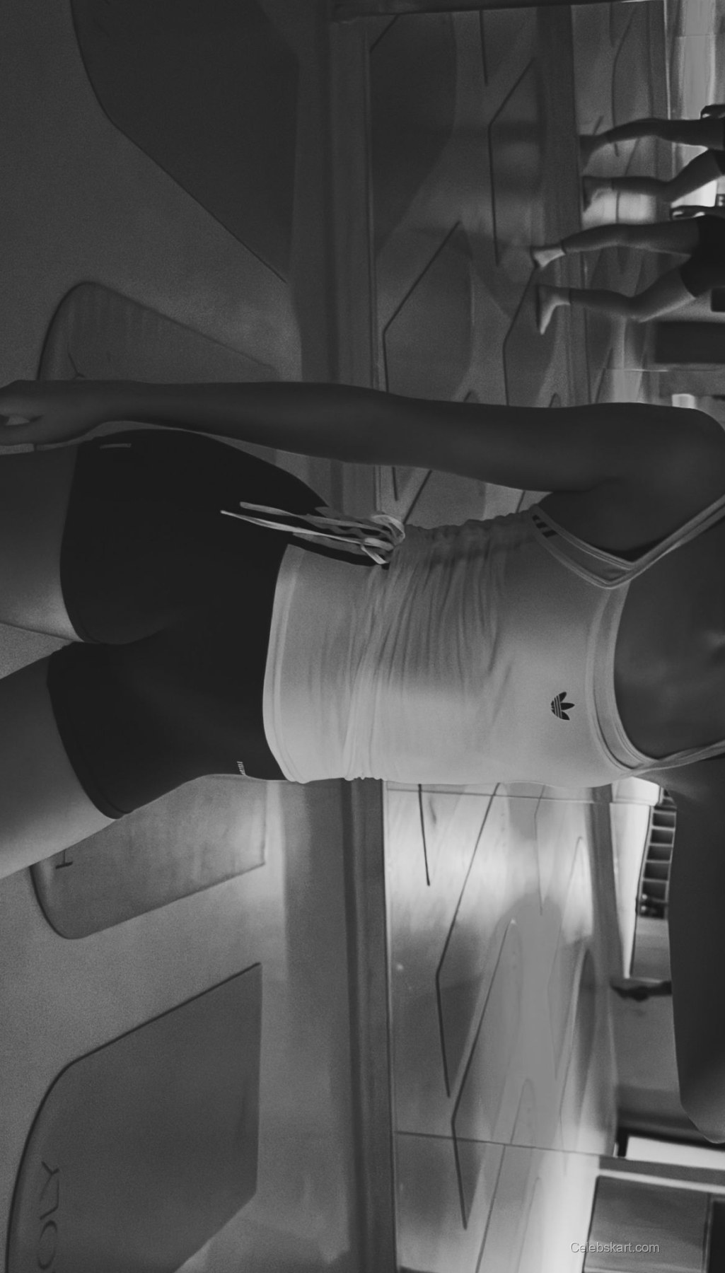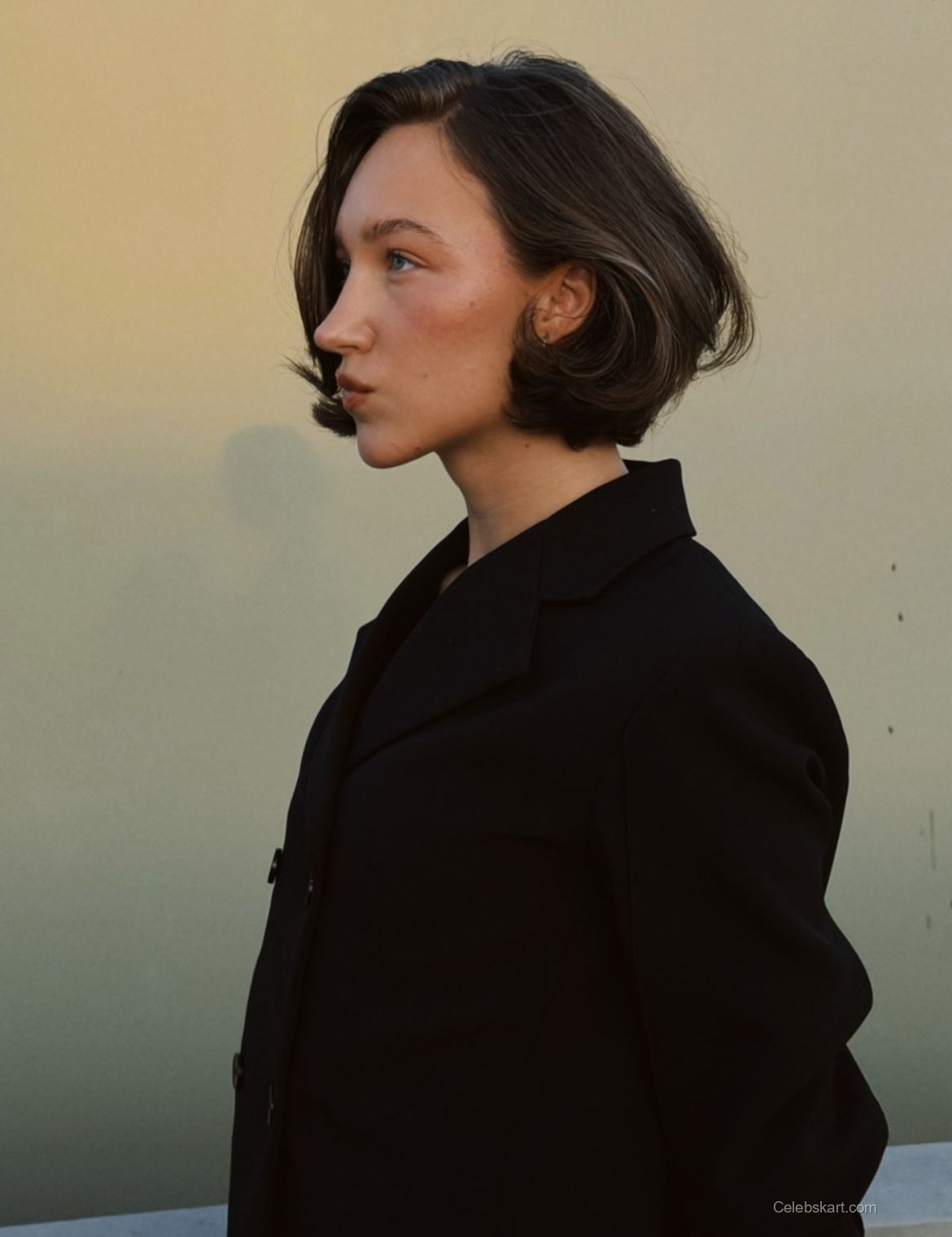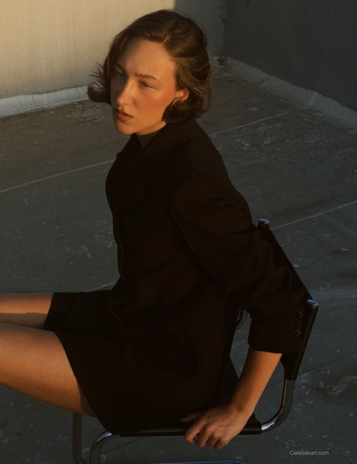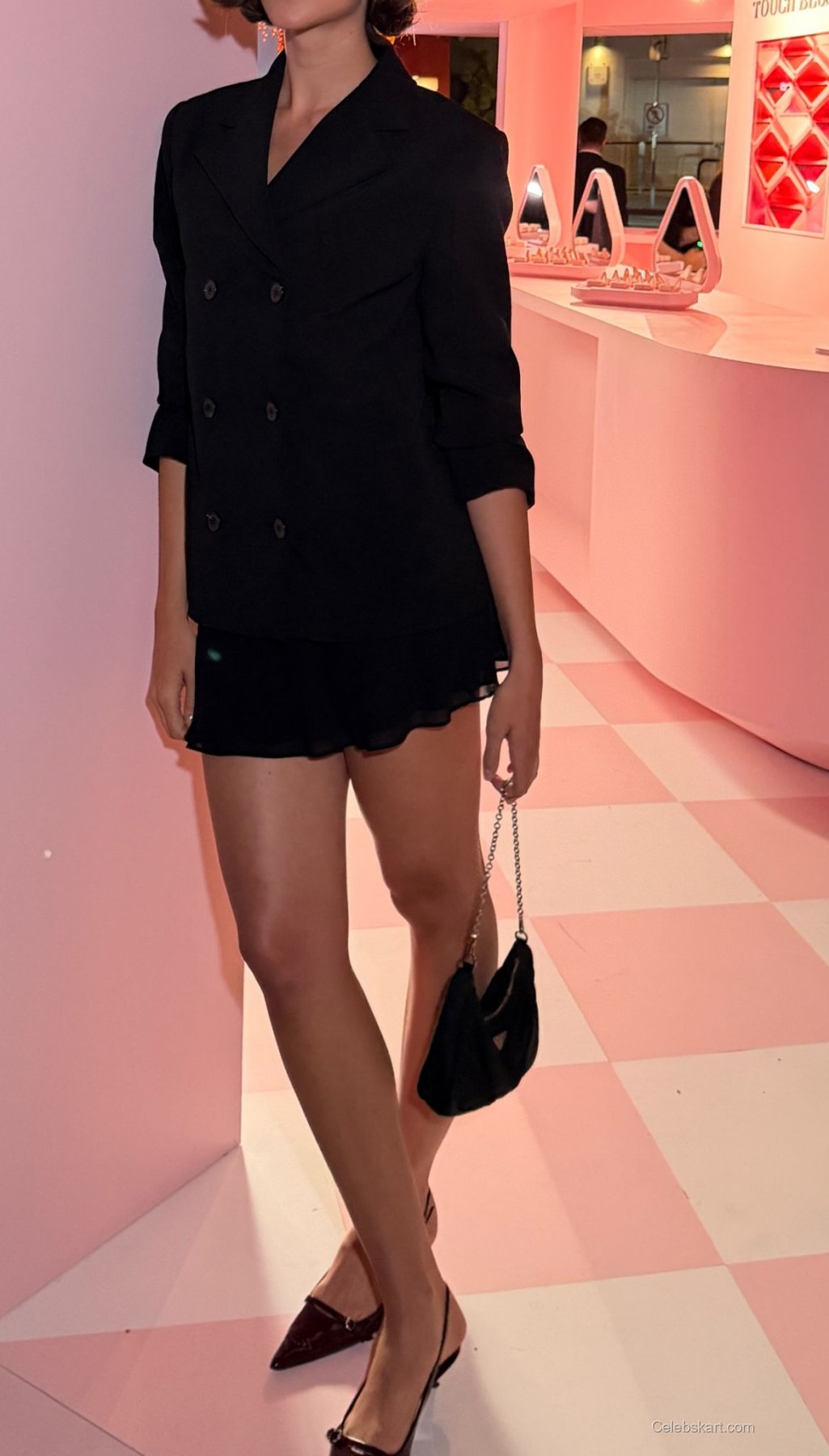 One of her standout looks features a tailored black blazer paired with a simple yet elegant ensemble. The sharp cut of the blazer emphasizes her figure while providing a polished, sophisticated appearance. She completed the outfit with pointed black heels that elevate the overall look and enhance her long legs. The contrasting sharpness of her outfit against the soft background creates a striking visual.