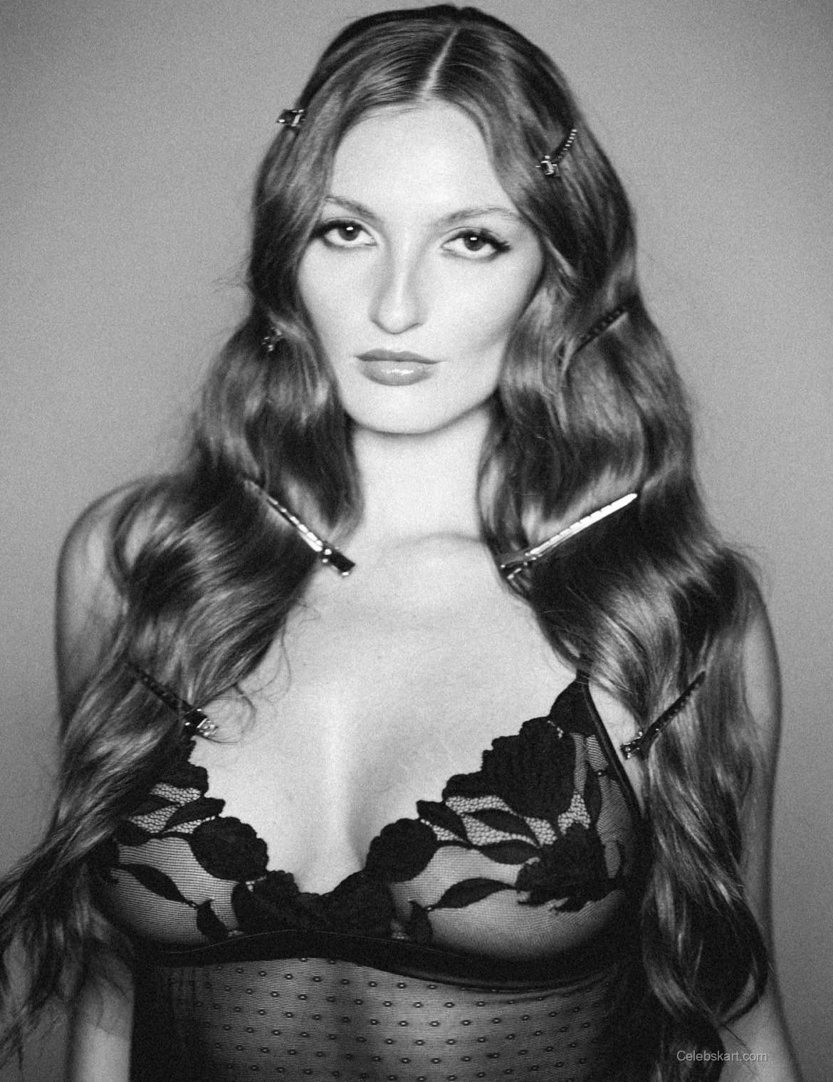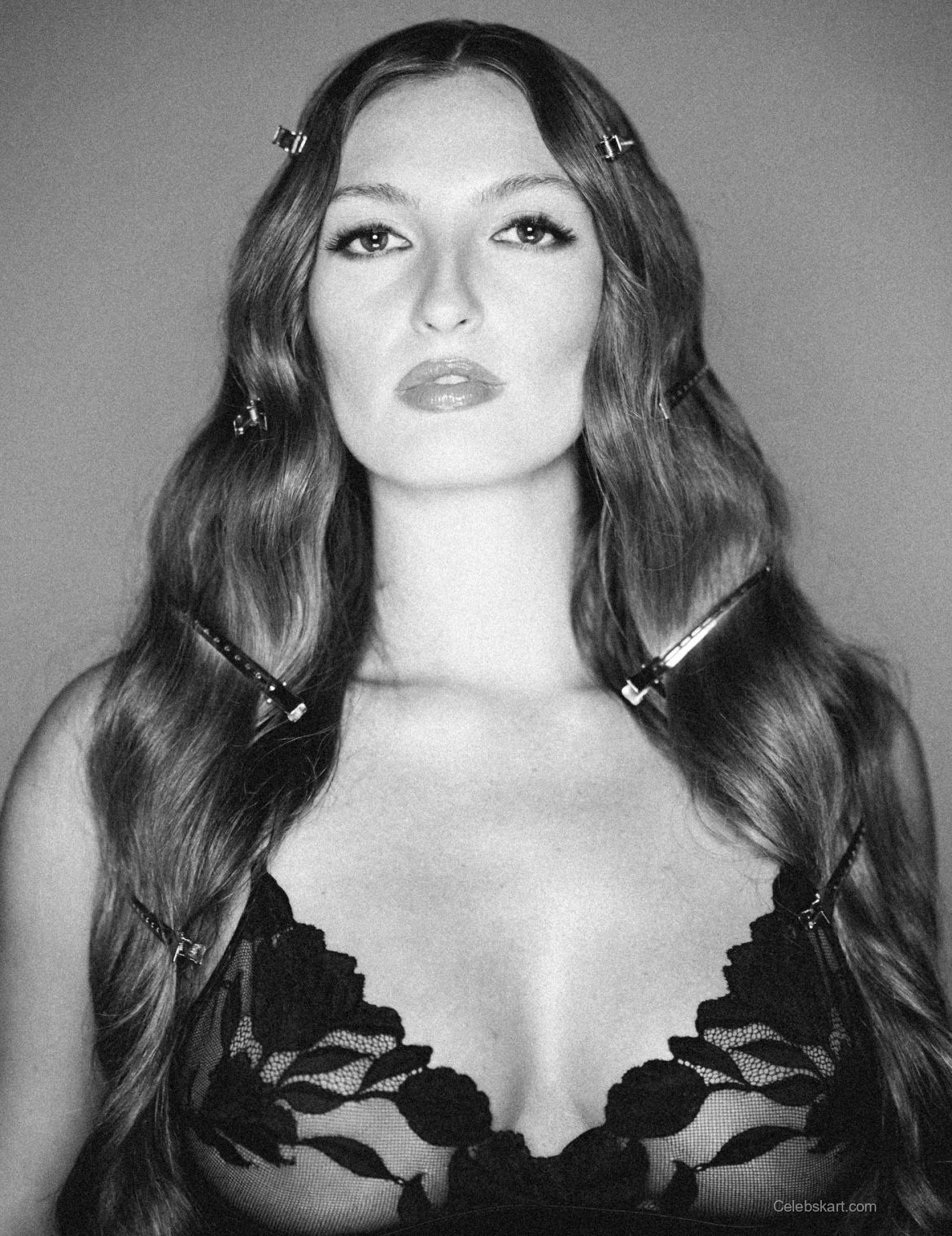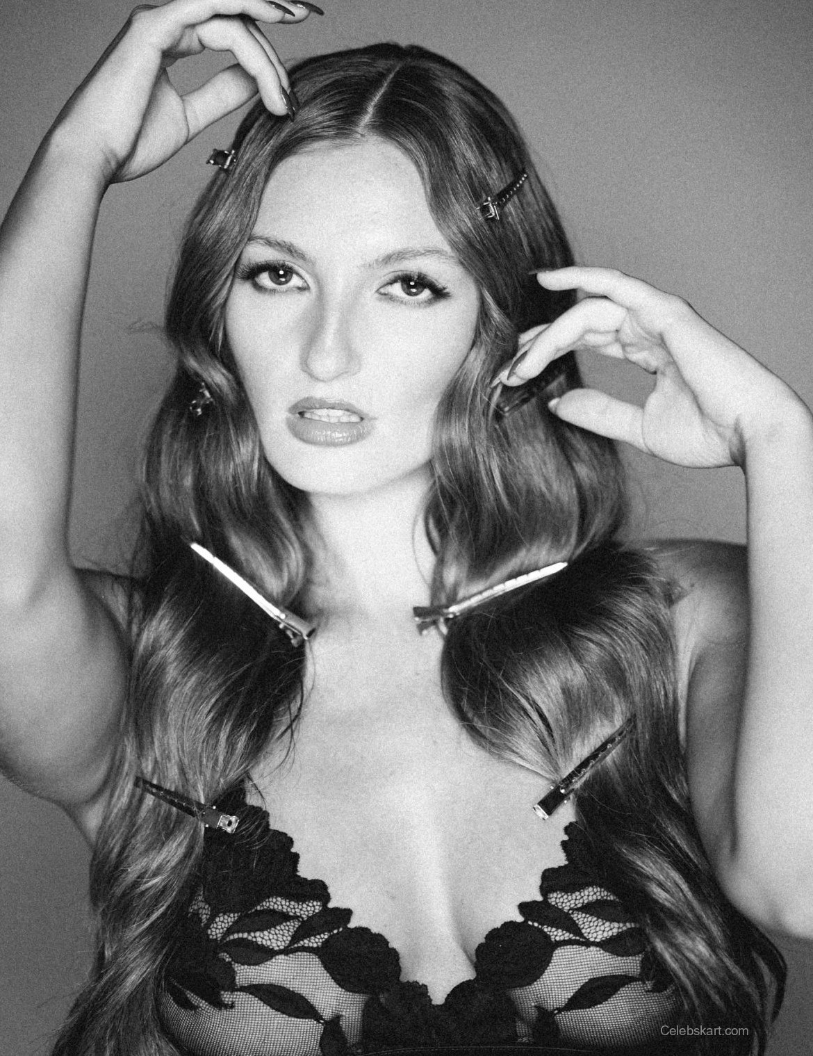 Avamarie posed confidently, holding her arms up to adjust her hair, which was styled in soft waves. The clips adorning her hair provided an artistic touch, enhancing the of her appearance. Her makeup was equally stunning, with a focus on bold, defined eyes that complemented her outfit perfectly. The backdrop was minimalist, allowing her look to take center stage and demonstrate her fashion prowess.
