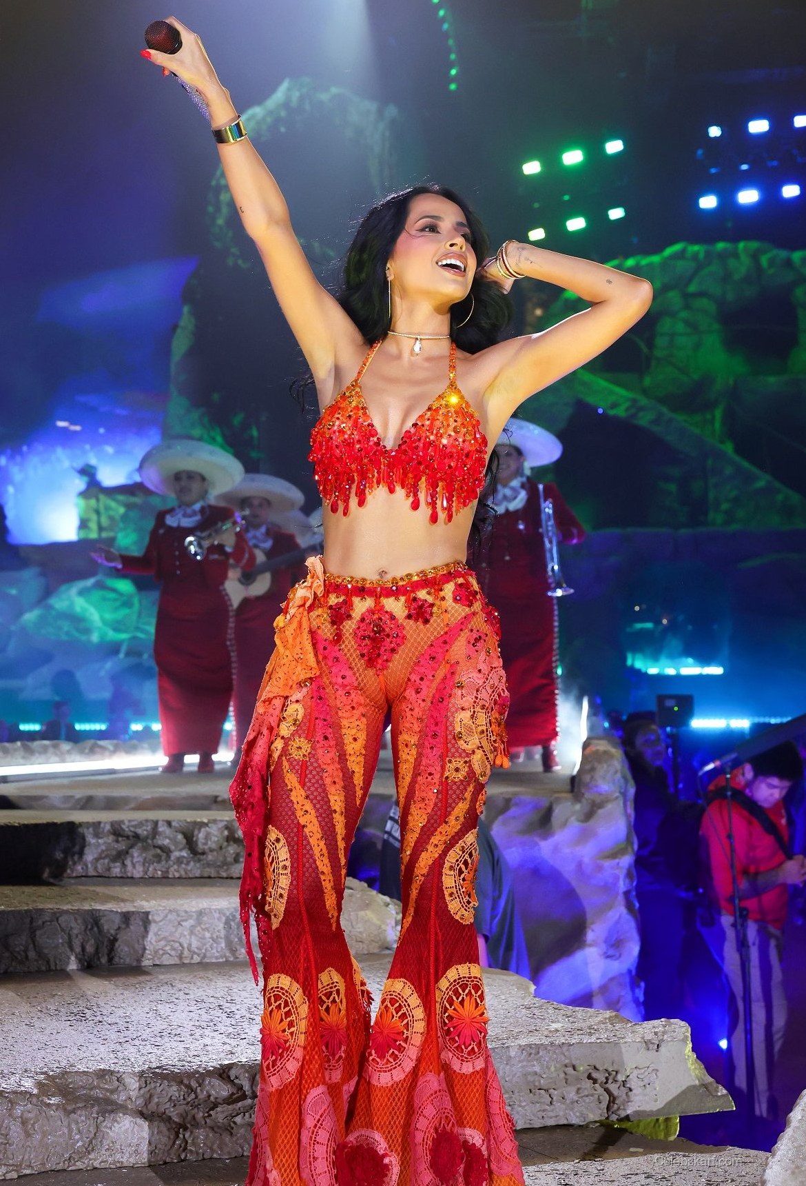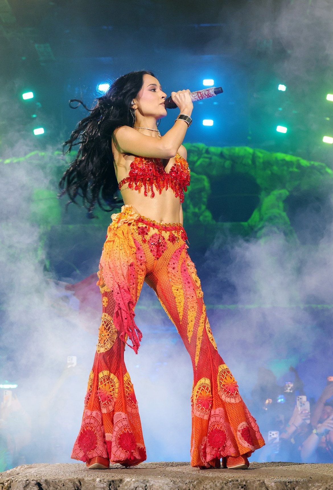 Becky G's outfit was a feast for the eyes, featuring a fiery red crop top adorned with intricate embroidery. The piece highlighted her toned physique, while the matching flared pants added a playful touch. The ensemble was completed with striking red platform boots that elevated her look, both literally and figuratively. As she performed, the outfit shimmered under the festival lights, drawing attention from fans and photographers alike. It was a perfect blend of fashion and function, allowing her to move freely on stage.