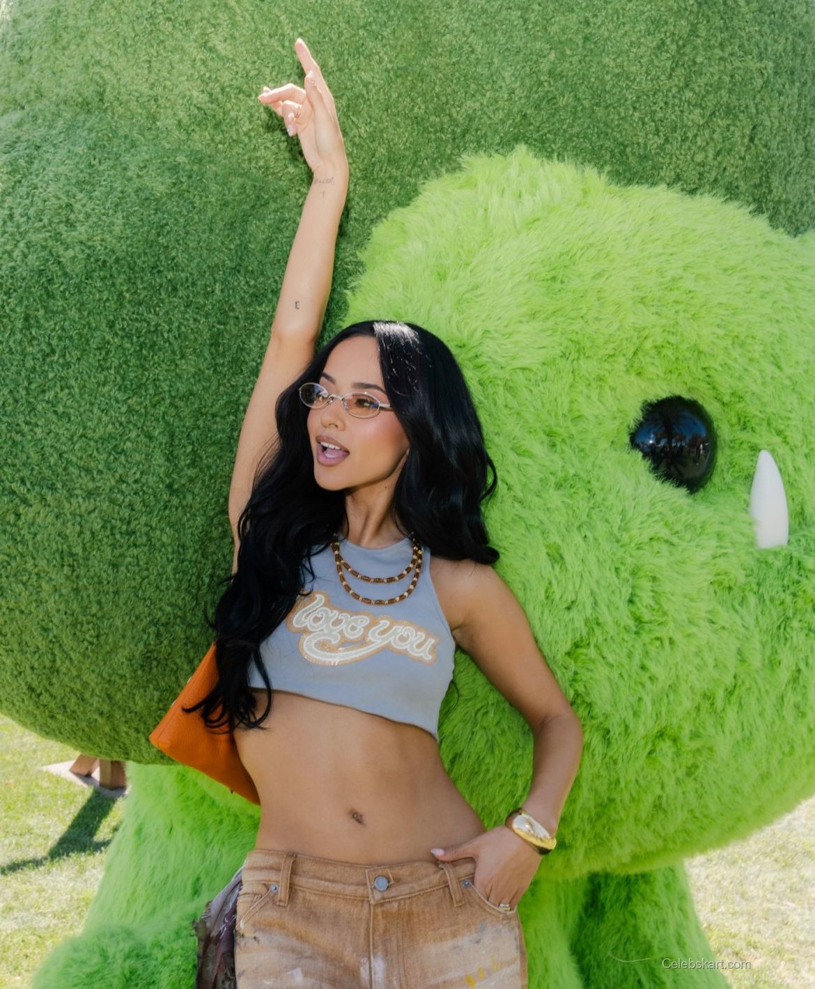 The playful pose Becky G strikes, with one arm raised and her body slightly turned, enhances the fun atmosphere of the post. Her long, flowing hair cascades down her shoulders, framing her face beautifully. The large green character behind her creates a whimsical backdrop, contributing to the overall cheerful vibe of the image. The bright daylight enhances her radiant complexion, making her features stand out.