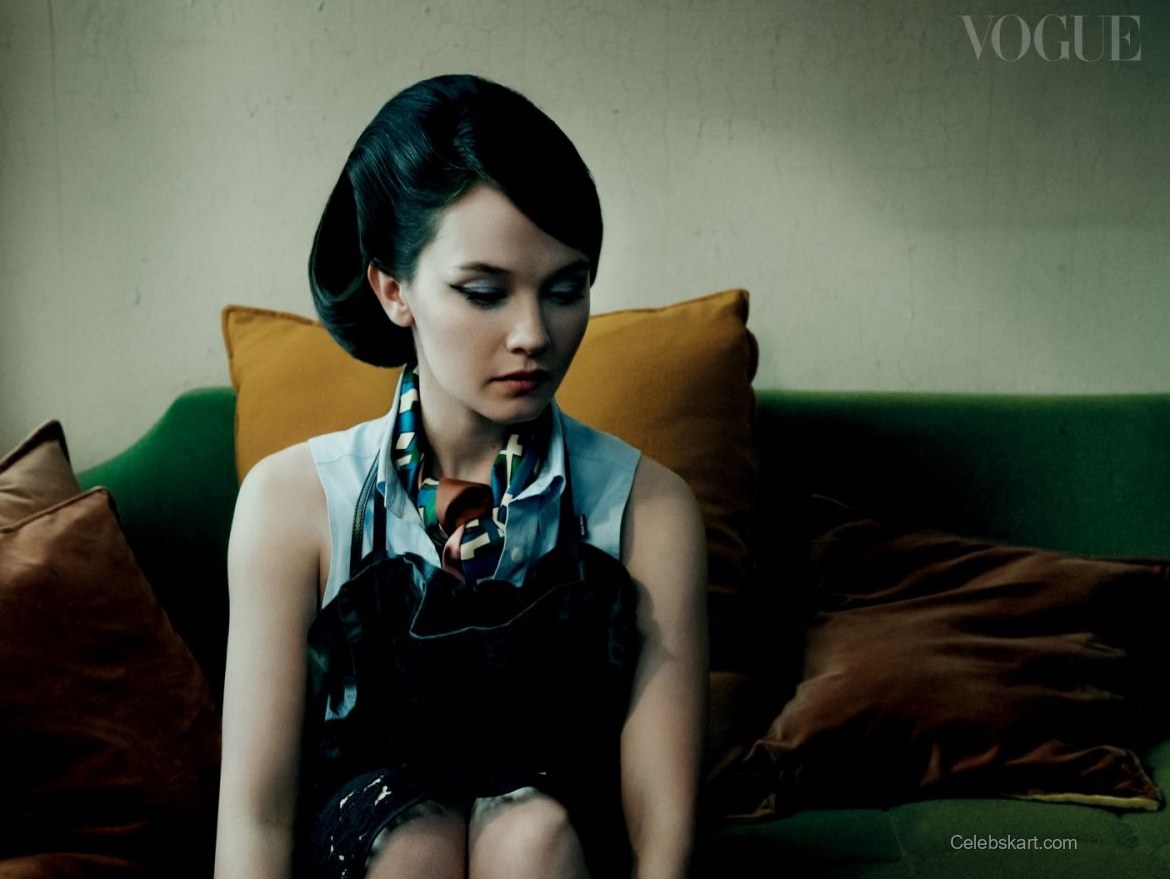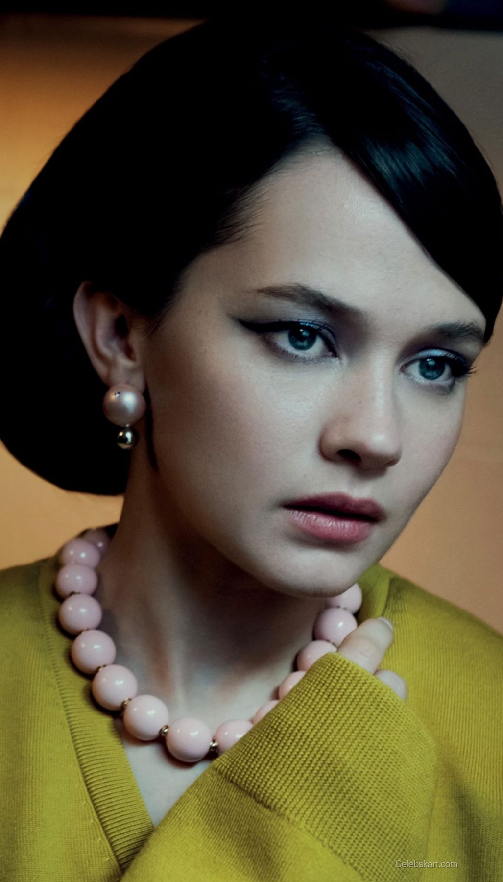 Cailee's presence is magnetic as she poses thoughtfully on a vintage-style sofa. The backdrop enriches her aesthetic, featuring warm tones that resonate with the colors of her outfit. Her hair is styled in an elegant updo that adds sophistication, while her makeup, with its subtle yet striking eyeliner, emphasizes her expressive eyes. Throughout the shoot, moments of interaction with her surroundings, such as glancing sideways or leaning forward slightly, create a sense of intimacy and engagement with the viewer.