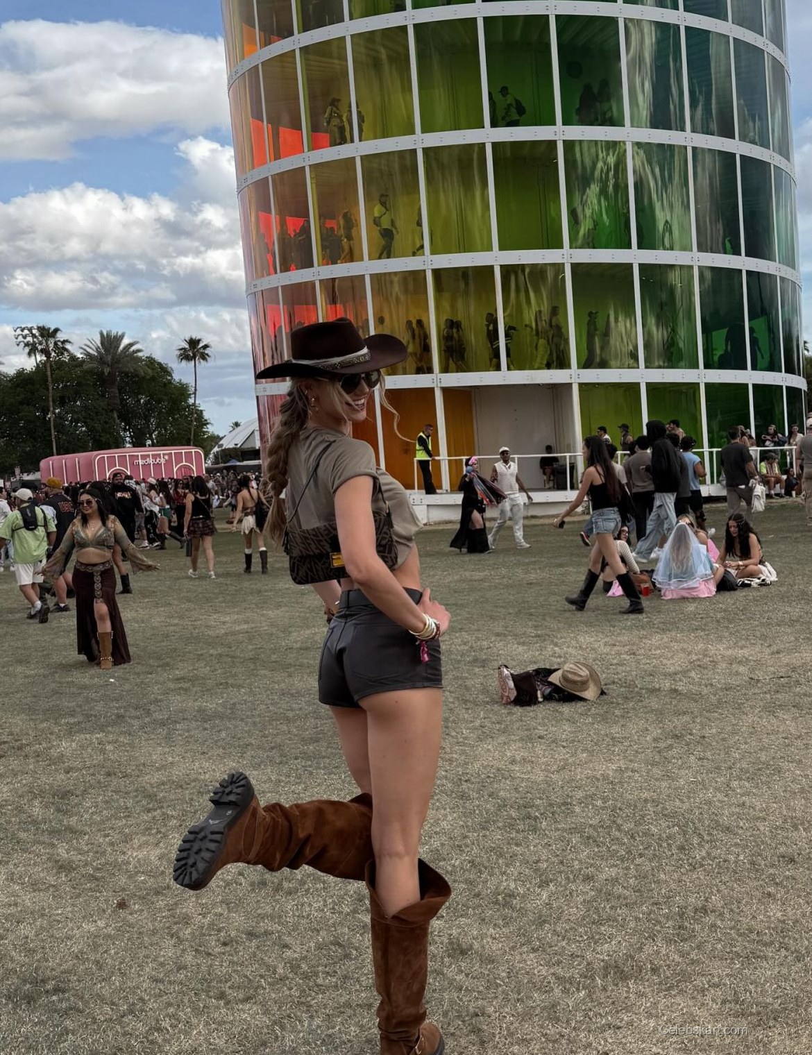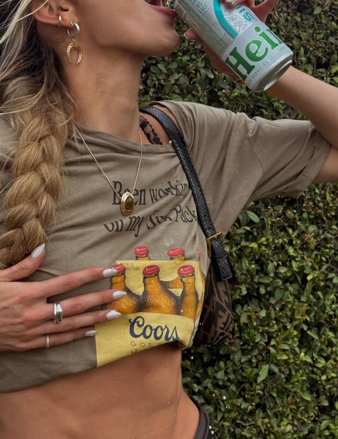 The standout piece of Cameron's outfit is undoubtedly her cropped t-shirt, which is adorned with a playful graphic that features iconic bottles of Coors. The earthy tones of the shirt complement her skin tone beautifully. She pairs this with fitted brown shorts that accentuate her figure, providing a great balance to the casual look. Completing the outfit, Cameron sports a wide-brimmed brown hat that adds a touch of flair and sophistication. Her choice of accessories, including layered bracelets and statement earrings, enhances the overall ensemble.