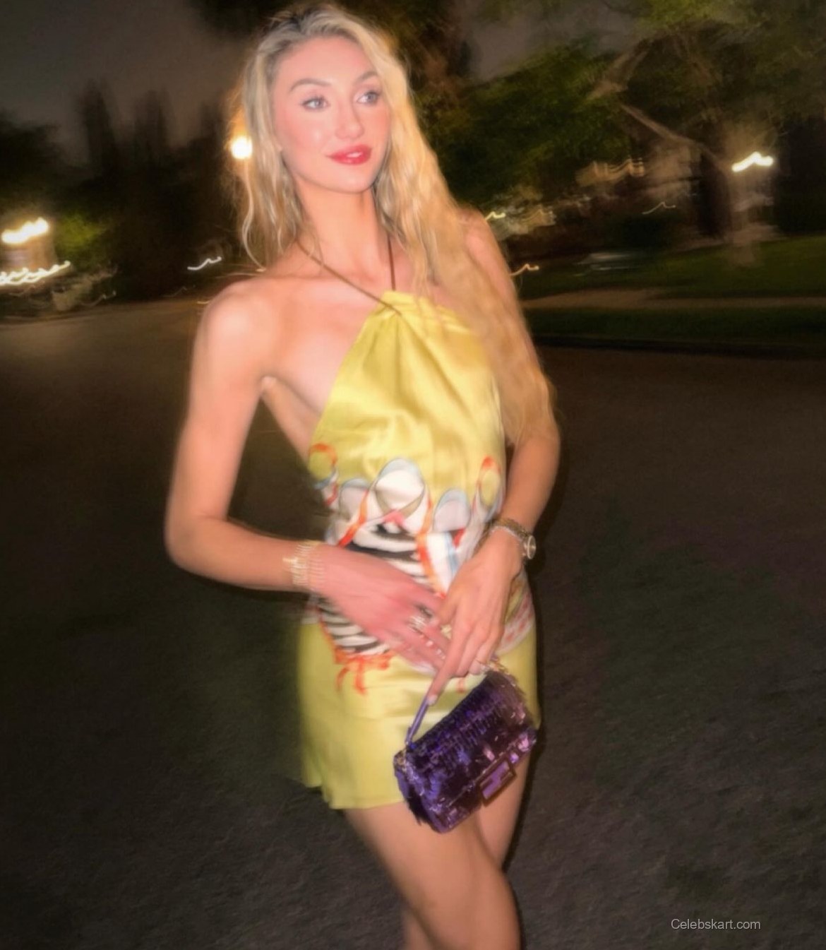 The focus of Cameron Brink's outfit is undeniably her eye-catching yellow dress. The intricate design includes playful swirls and a mix of colors that beautifully contrast her flowing golden locks. Complementing her outfit, she carries a small purple purse, adding a pop of color that enhances the entire look. To complete this vibrant ensemble, Cameron opts for delicate jewelry, showcasing her sophistication and attention to detail. For more gorgeous looks, check out our feature on Cameron Brink's fashion.