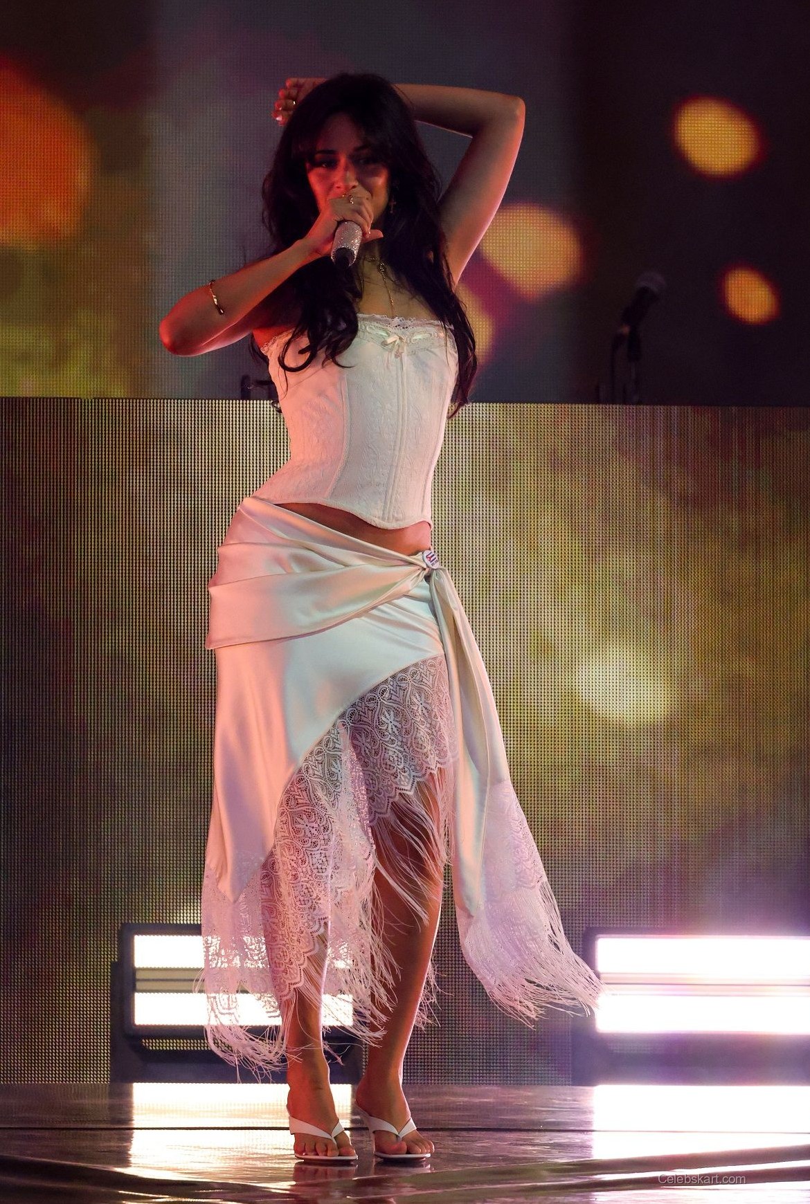 Camila's outfit featured a fitted white corset that accentuated her figure, paired with a flowing skirt that had intricate lace details and fringes. The combination created a soft yet bold look, perfectly suited for the vibrant atmosphere of Coachella. Her choice of accessories, including delicate bracelets and a simple necklace, complemented the outfit without overwhelming it. The light fabric of her ensemble moved gracefully as she performed, enhancing her every move and captivating the crowd.