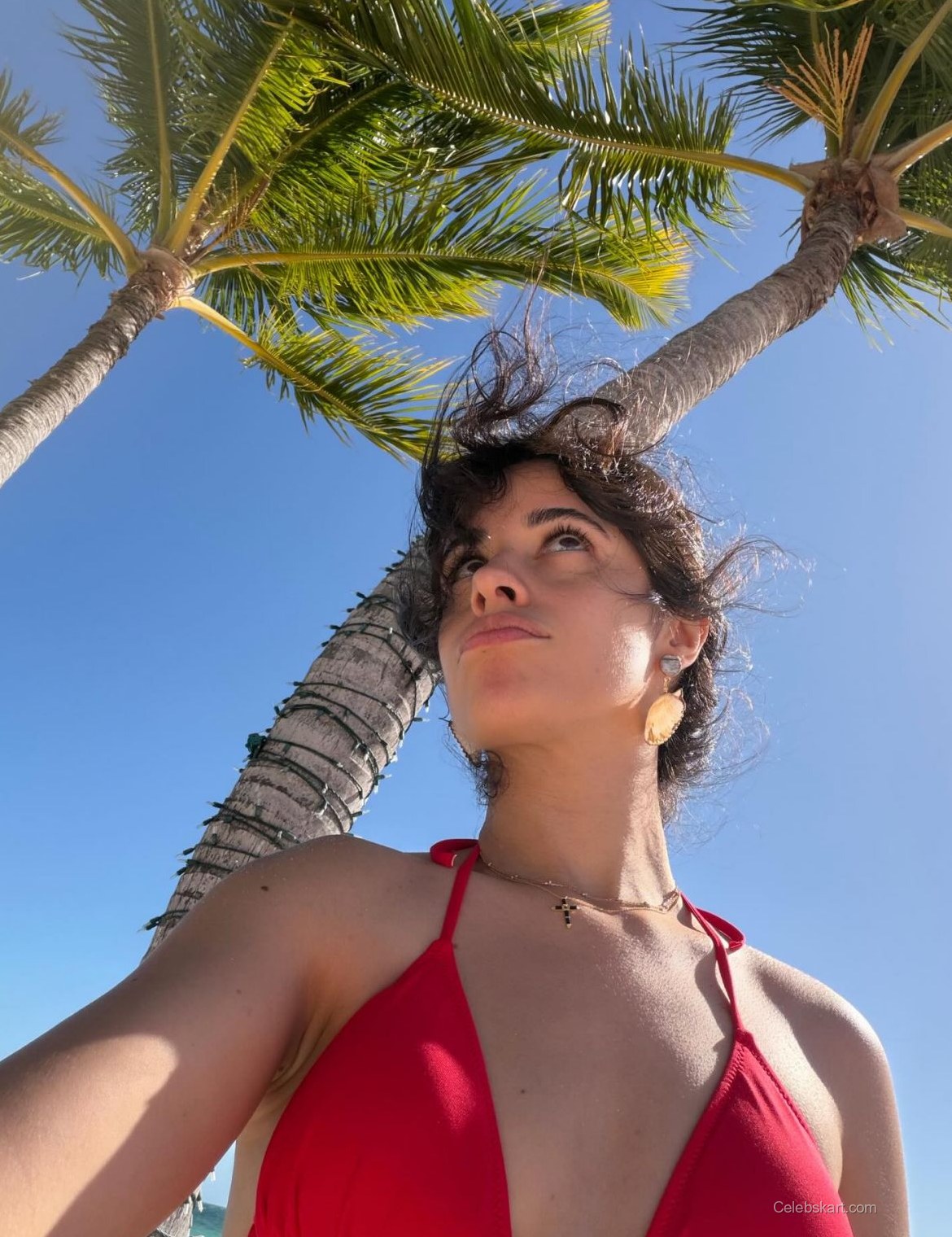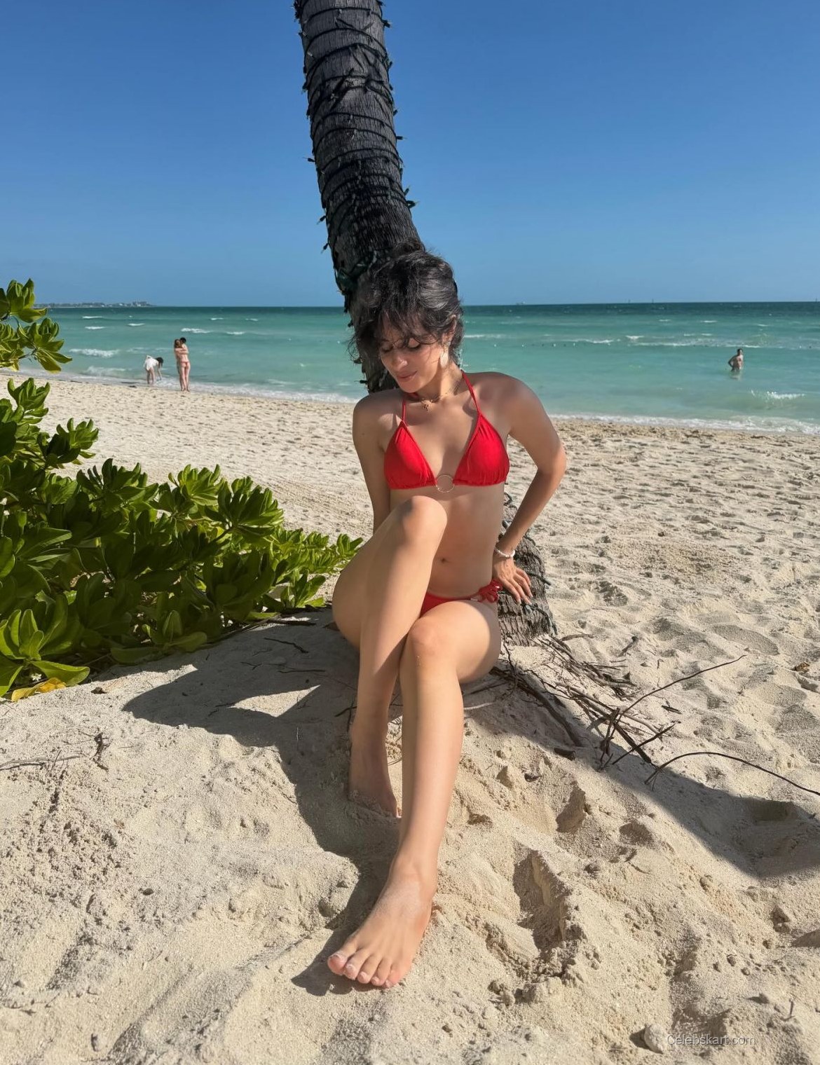 In these pictures, Camila is seen wearing a red bikini featuring a chic design with a ring accent at the center. The bikini top supports her figure well, while the matching bottoms are tied on the sides, showcasing her curves. This vibrant swimwear not only enhances her look but also reflects the essence of summer fun. Check out more of Camila's stunning styles here.