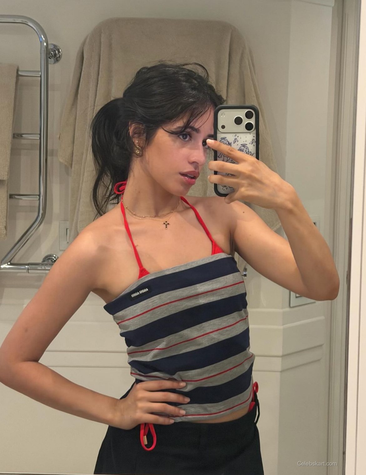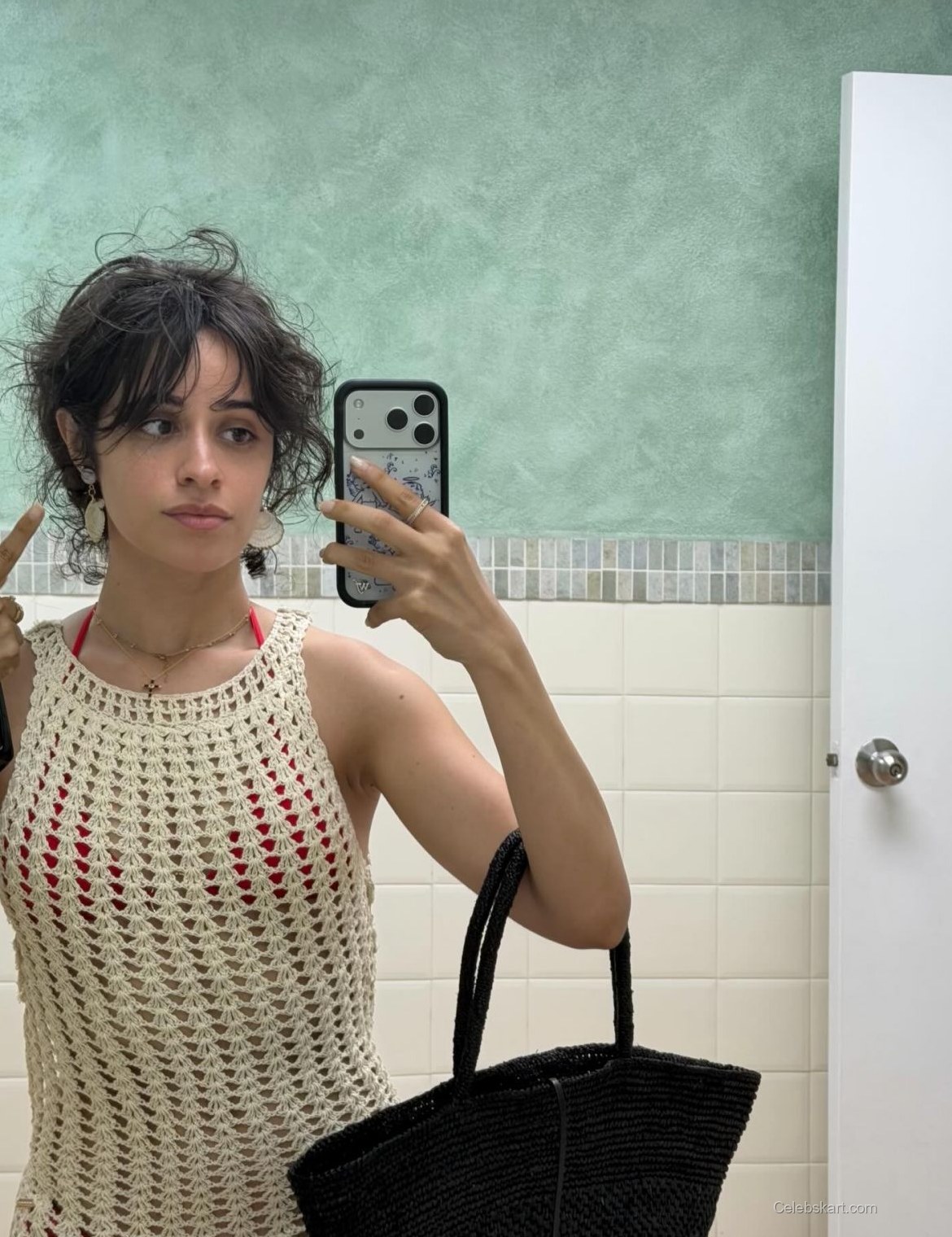 Camila poses confidently as she holds out her phone for a selfie, with bright sunlight illuminating her features. Her beach hair is tousled with the ocean breeze, adding to the laid-back vibe. In one shot, she is seen sitting against a palm tree, displaying a natural moment of beauty. Her playful expression captures the joy of summer, making it a relatable snapshot for her fans. For more casual beach styles like Camila's, see such outfits here.