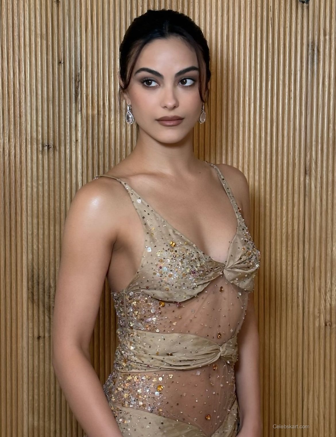 Camil Mendes wore a sheer mesh gown adorned with sparkling embellishments. The soft nude tones contrasted beautifully against her skin, making her look radiant. The gown featured intricate detailing, with sequins that caught the light gracefully as she moved. Each element of her outfit, from the elegant neckline to the flowing silhouette, highlighted her figure while maintaining a refined appearance. This ensemble was perfect for a star-studded event, showcasing not just fashion but also personality.