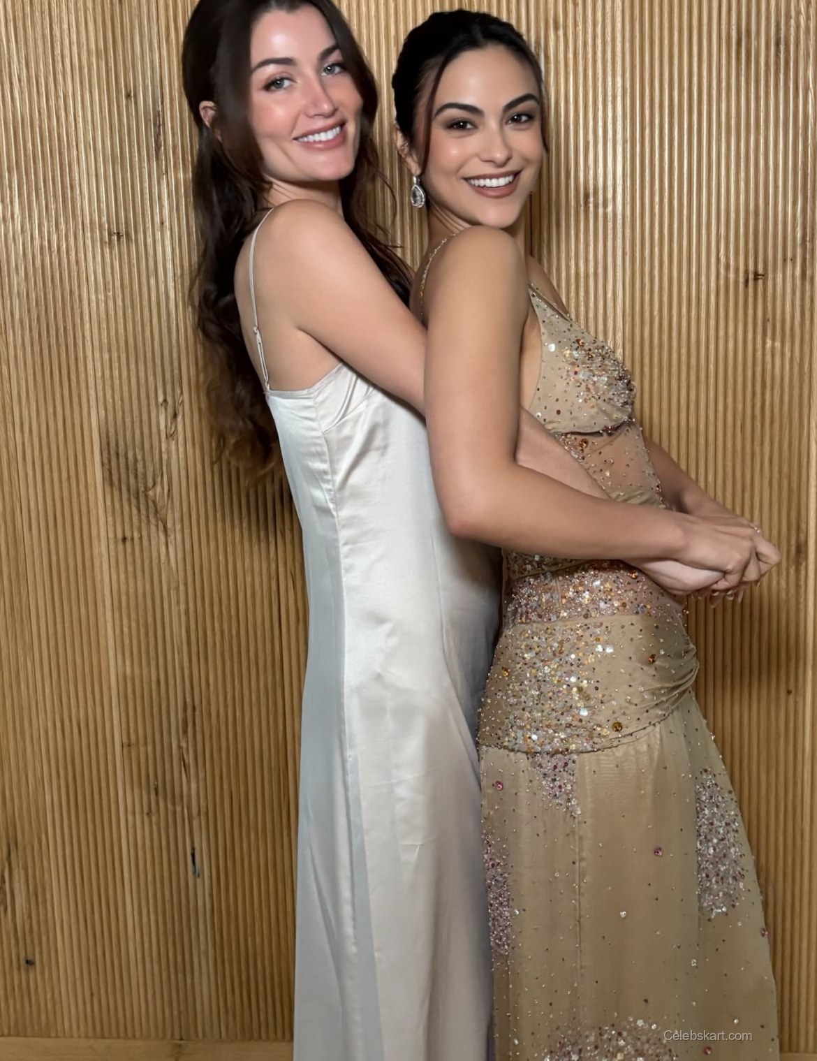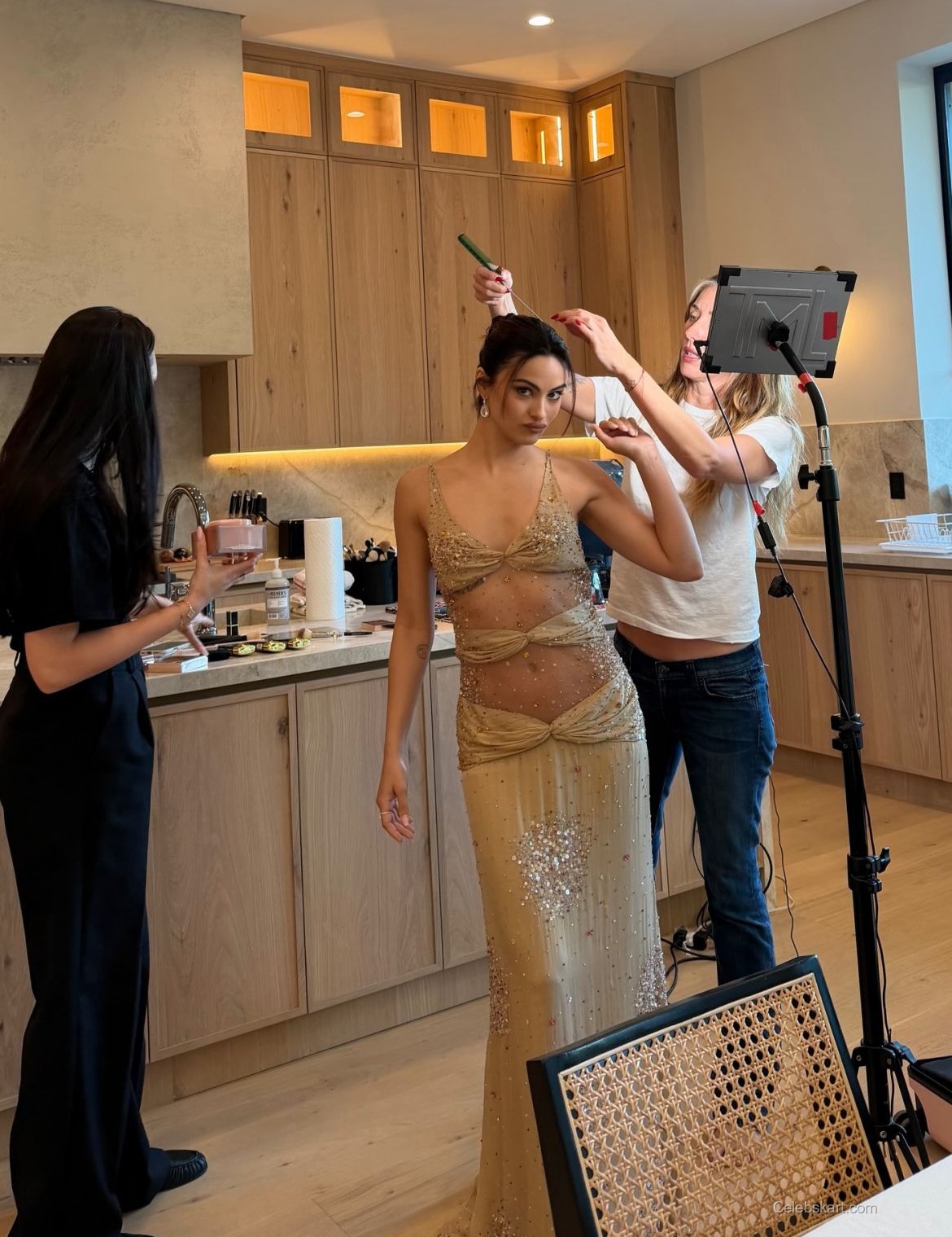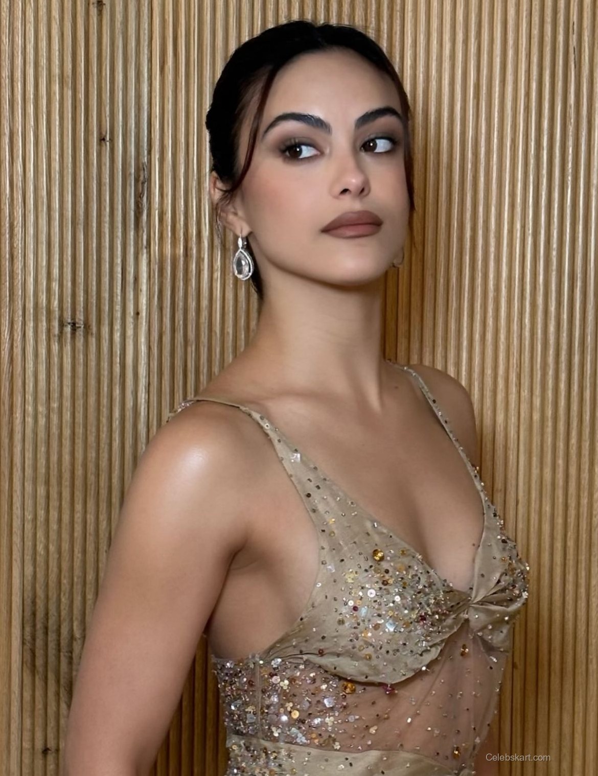 Camila posed gracefully against a wooden backdrop, allowing her outfit to take center stage. Her hair was styled in loose waves that complemented her neckline, framing her face beautifully. With her subtle makeup, she created a natural look that highlighted her features rather than overpowering them. This choice gave her an ethereal quality, enhancing the overall elegance of her appearance. As she adjusted her hair, the glittering gown glimmered, adding a magical touch to the atmosphere.