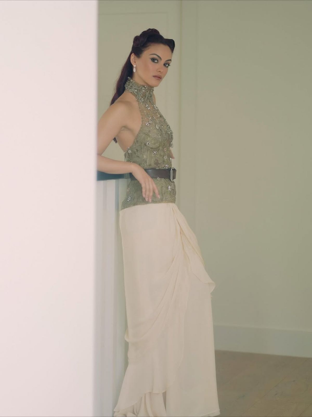 Camila Mendes seen in Versace Neon Stylish Dress at a Photoshoot