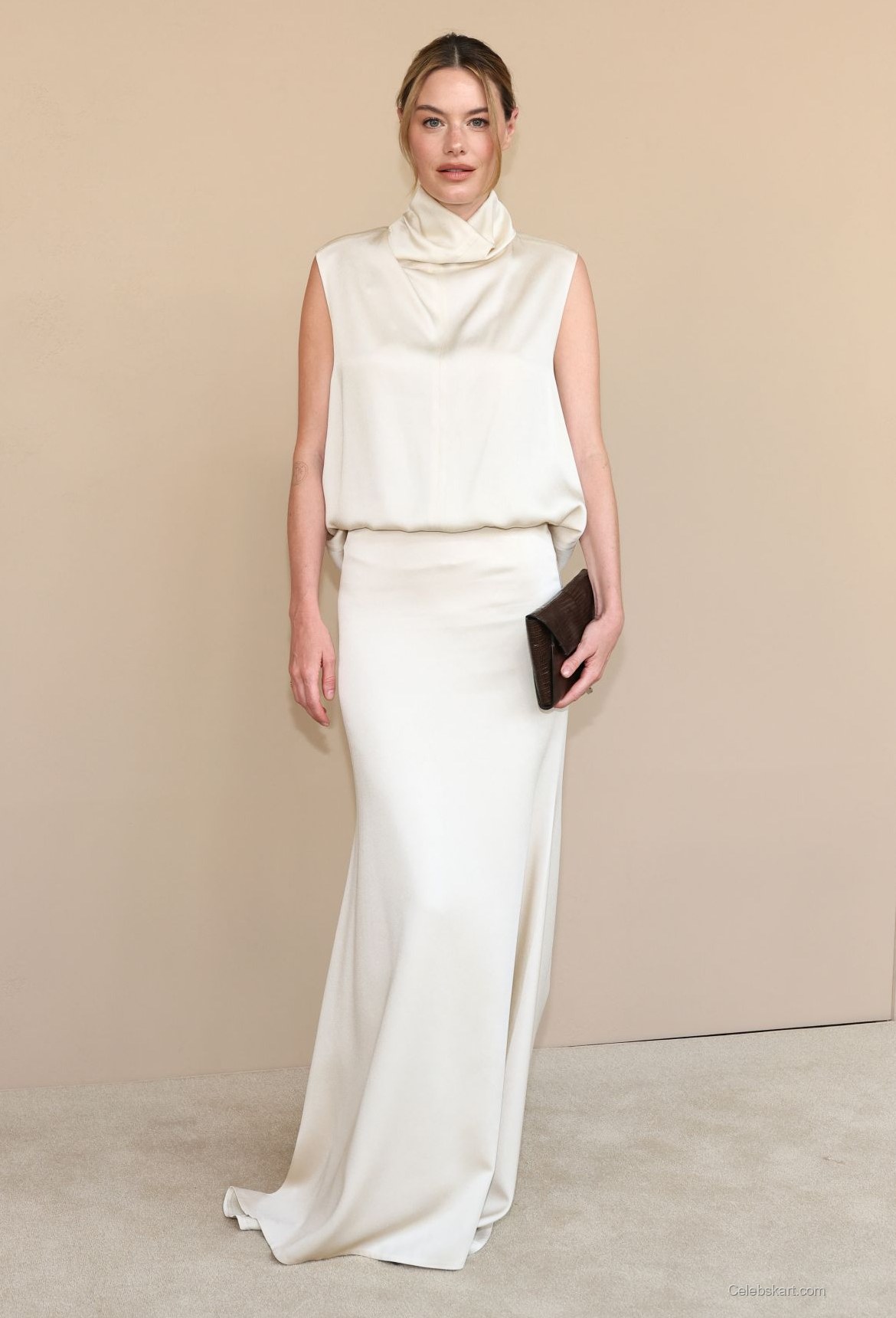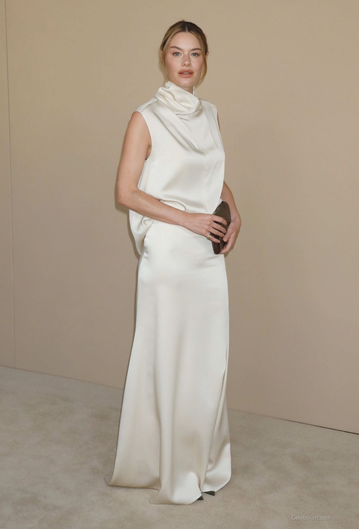 The gown featured a high cowl neck and sleeveless design, which gracefully flowed down to the floor, creating a sleek silhouette. The fabric had a subtle sheen, enhancing the overall elegance of the look. Rowe accessorized with a chic brown clutch that added a touch of contrast to her ensemble, demonstrating her eye for detail. The simplicity of her outfit allowed her natural beauty to shine through, making a bold statement without overwhelming the senses.