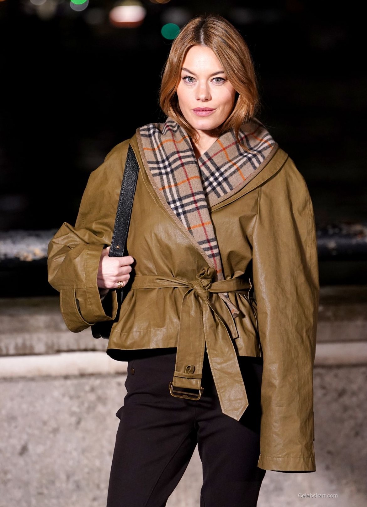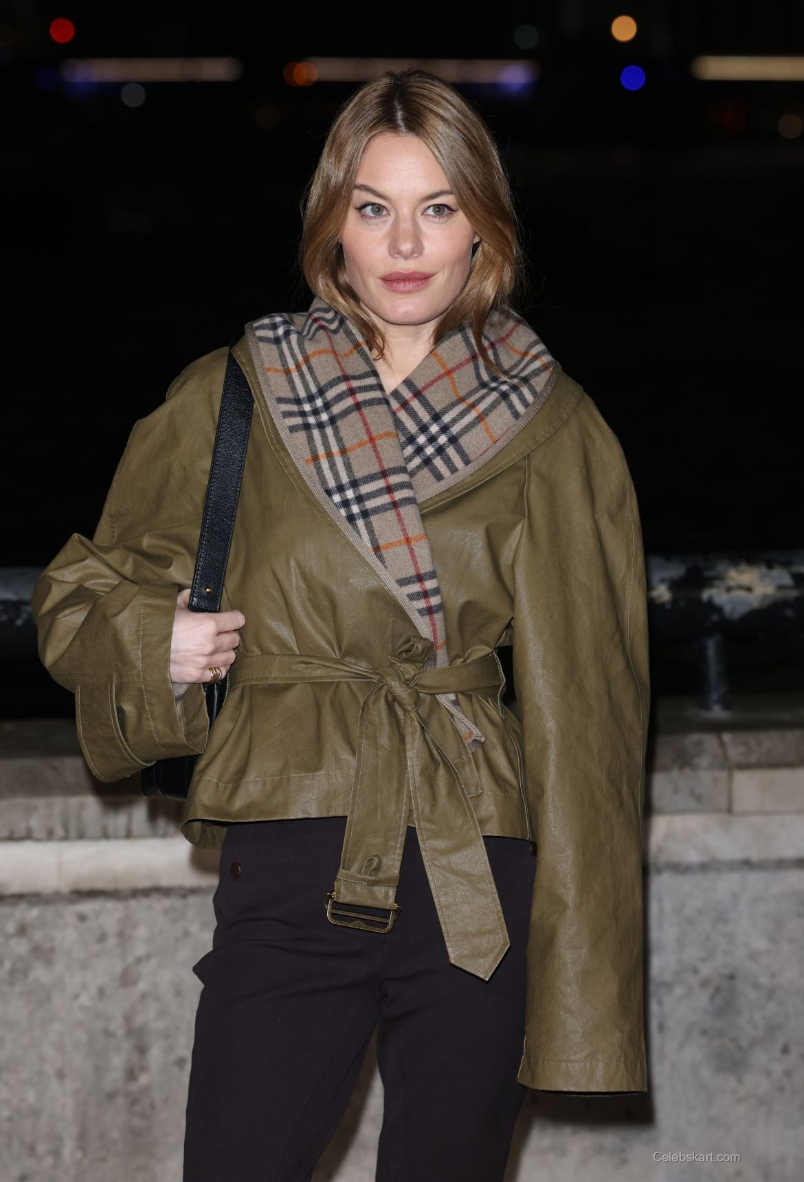 For the February 2026 presentation, Camille Rowe opted for a refined yet relaxed ensemble that aligned beautifully with Burberry’s signature British heritage style. The look featured clean lines, muted seasonal tones, and understated accessories that allowed her natural presence to stand out. Her beauty styling leaned toward soft, natural makeup paired with loose, effortless hair, reinforcing her recognizable off-duty model vibe.