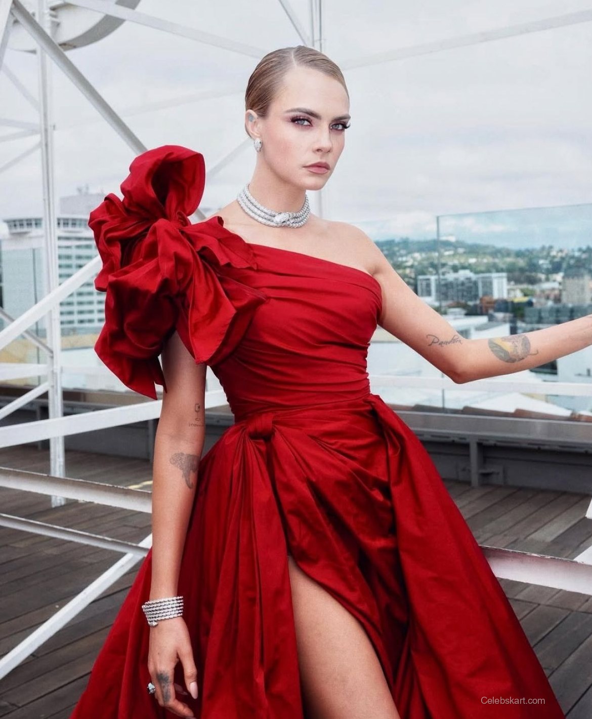 The highlight of Cara's outfit is the striking red dress. Made from a luxurious fabric, it features a soft sheen that catches the light flawlessly. The silhouette hugs her curves while the asymmetrical design keeps things edgy and fresh. This stunning ensemble is completed with red platform heels that elevate her look further and provide a chic finish. The combination of bold red and well-fitted cuts sets a new standard for modern fashion aesthetics. You can witness more of Cara’s captivating style by checking out Cara's latest looks.