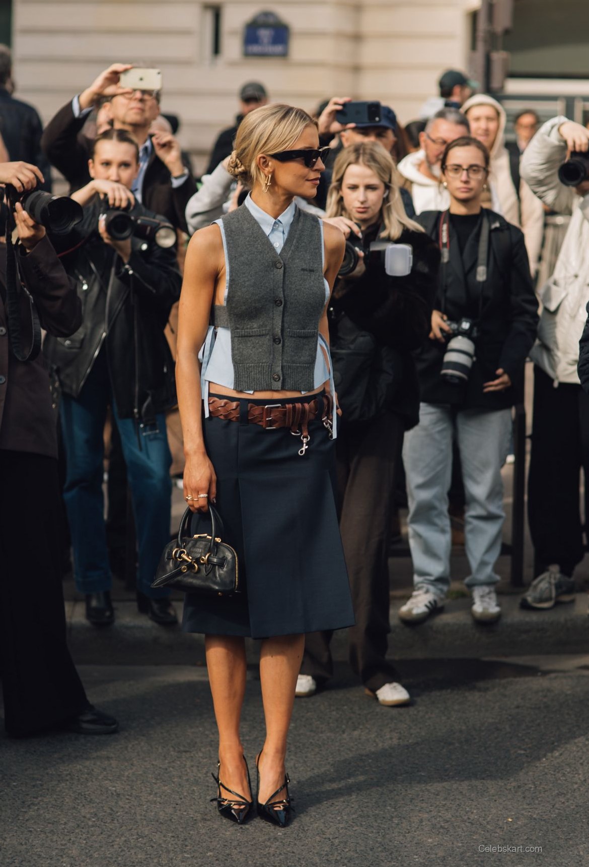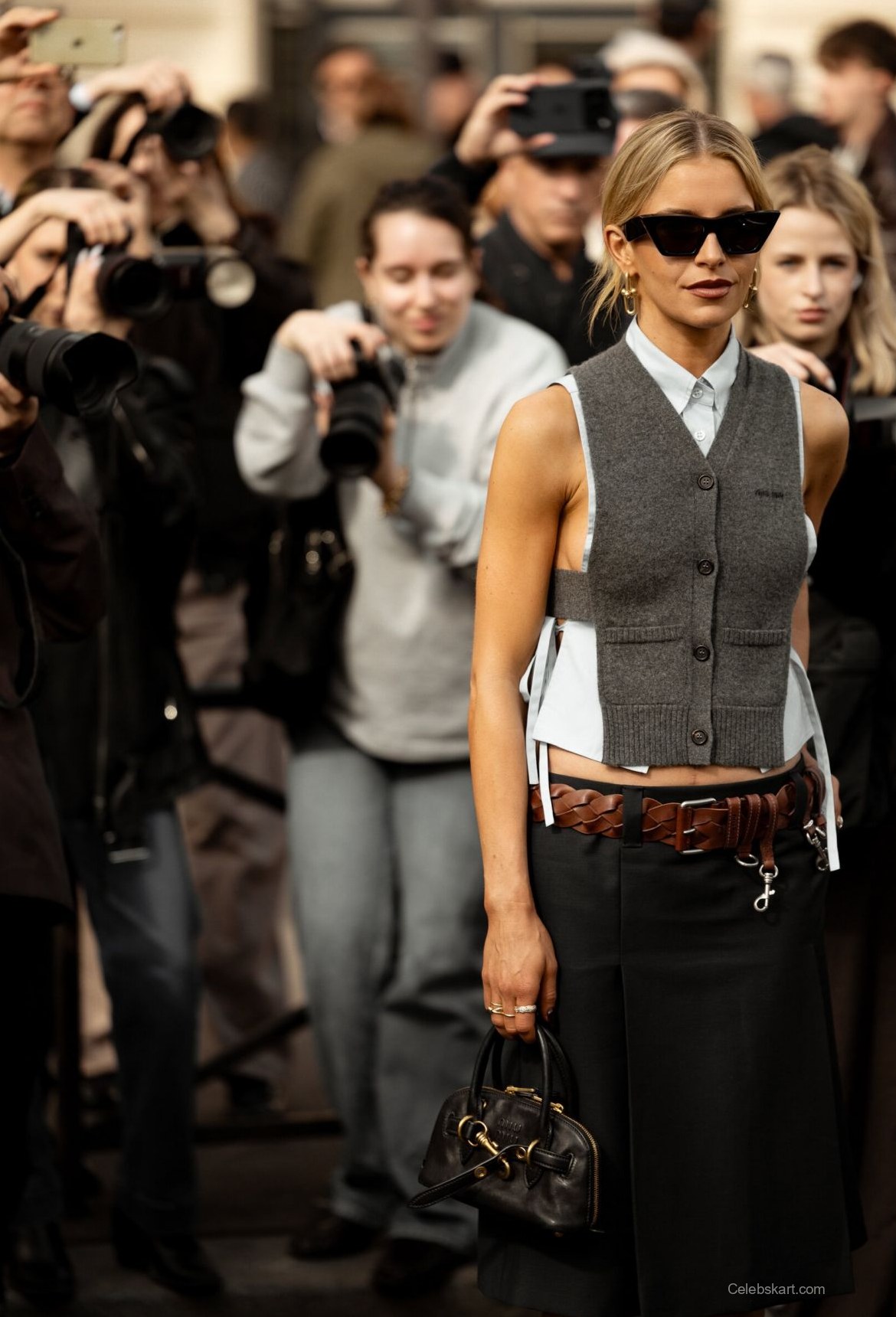 The layered look of the grey vest over a classic shirt was a clever choice that not only highlighted her figure but was also aligned with current fashion trends. The Miu Miu Fashion Show emphasizes innovation, and Caroline's outfit encapsulated this perfectly. The stylish brown leather belt cinched her waist, further enhancing her proportions, while her elegant heels made her legs appear longer. This attention to detail is what made her ensemble truly exceptional.