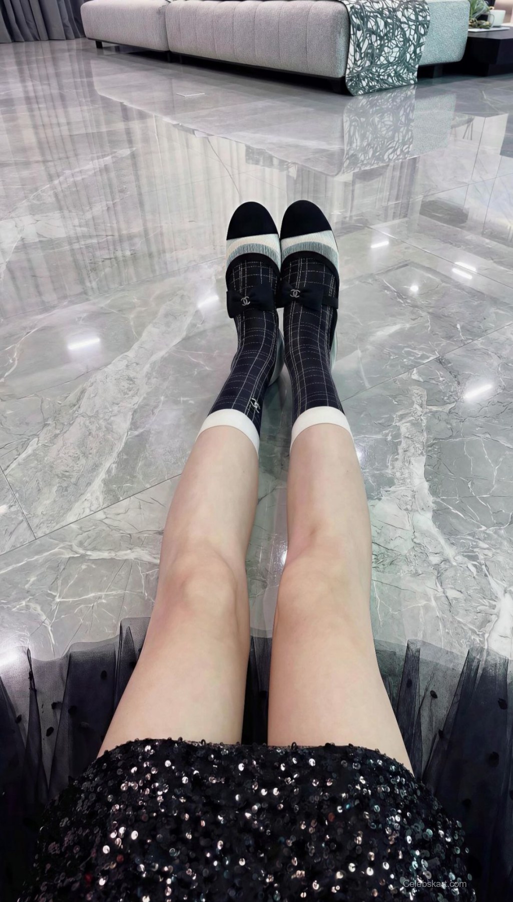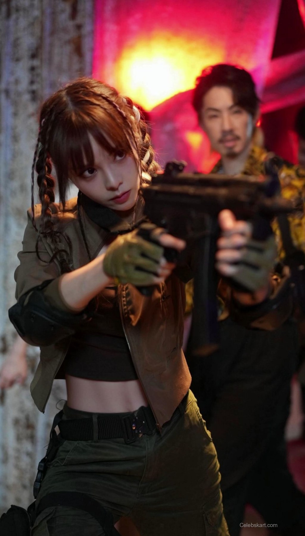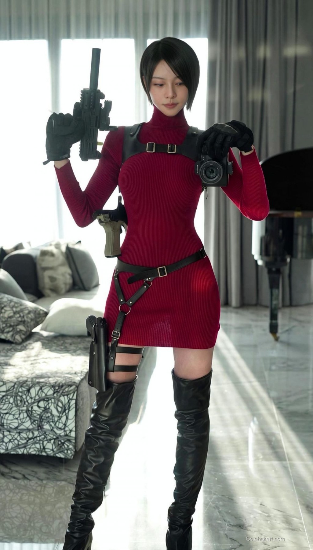 In this captivating moment, Cathryn strikes a fierce pose, showcasing her outfit's dynamic elements. The way she holds a camera, complemented by a gun, suggests a playful yet powerful demeanor. The room’s modern backdrop—designed with sleek furnishings—serves to enhance her striking look, making it the focal point of the photo.