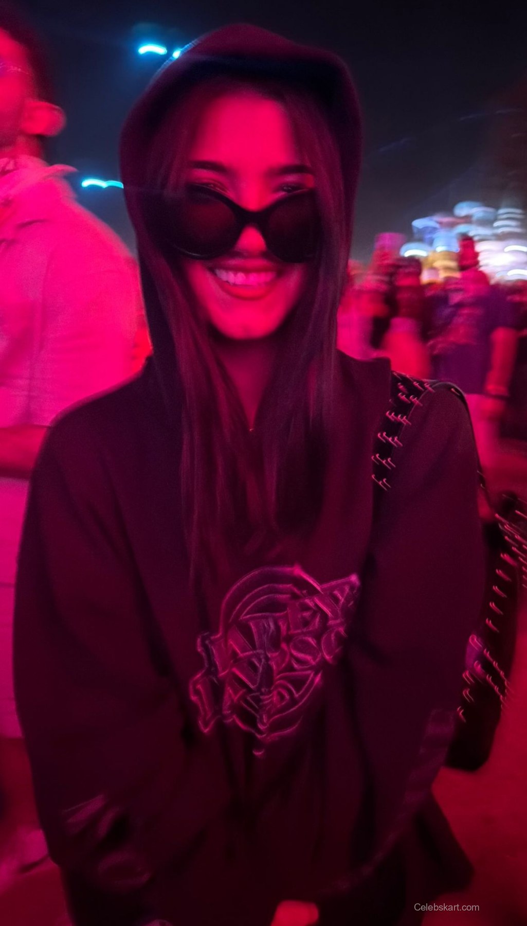 In the photos, Charli is seen wearing a striking black hoodie emblazoned with a bold graphic. The hoodie features intricate designs that catch the eye, especially against the vibrant concert lights. She pairs this with oversized sunglasses that add an element of mystery and flair to her overall appearance. The outfit is completed with a stylish black bag, showcasing her attention to detail and personal style.