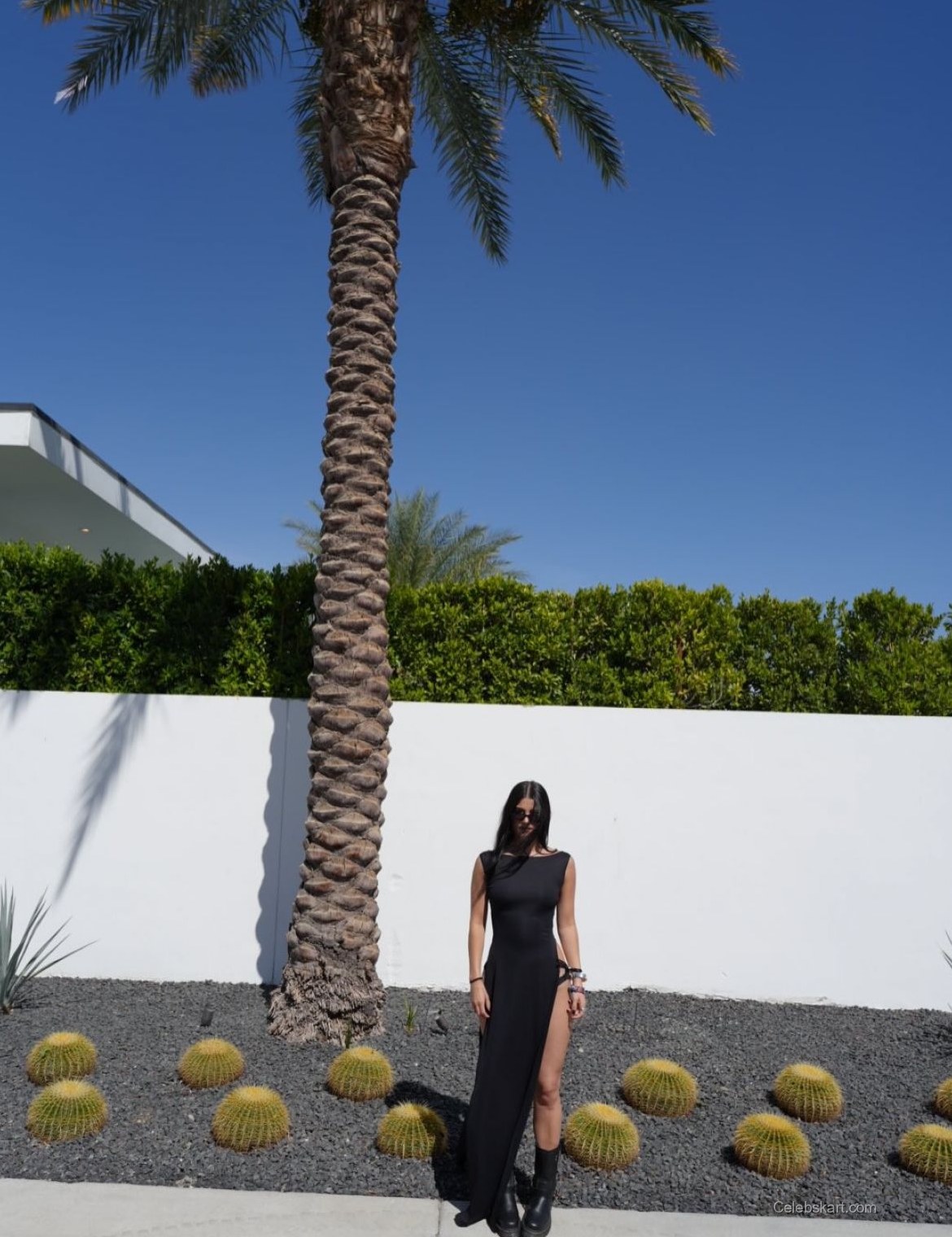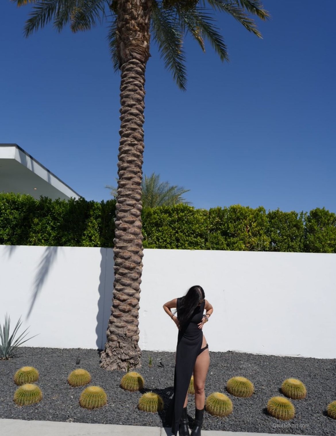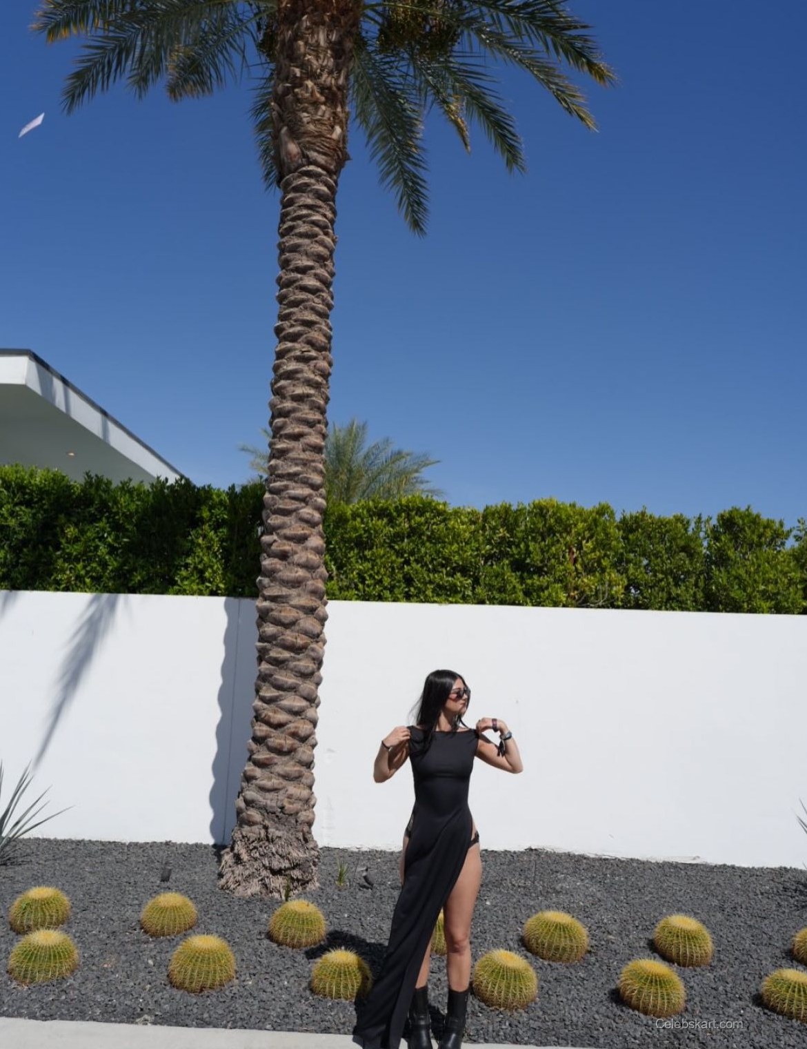 In this Instagram photo, Charli sports a sleek black outfit that features a daring cutout design. The outfit consists of a fitted bodice that transitions into a flowing skirt, creating a perfect silhouette. A standout detail is the black belt with a circular buckle, which adds a element to the look. The outfit is complemented by her choice of accessories, including a stylish black handbag and sunglasses, showcasing her refined taste.