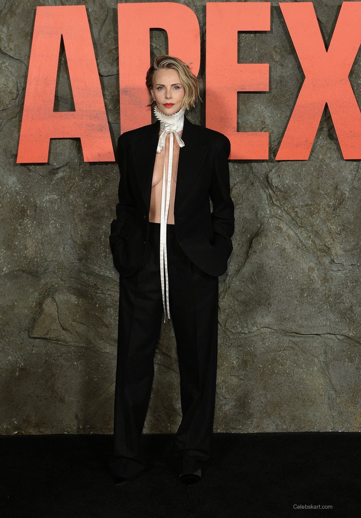 The Apex Premiere was marked by Charlize Theron's bold fashion choice. She showcased a black suit featuring a deep, open front. The jacket had clean lines and structured shoulders. The white choker added an interesting contrast to the dark outfit, tying in beautifully with her overall look.