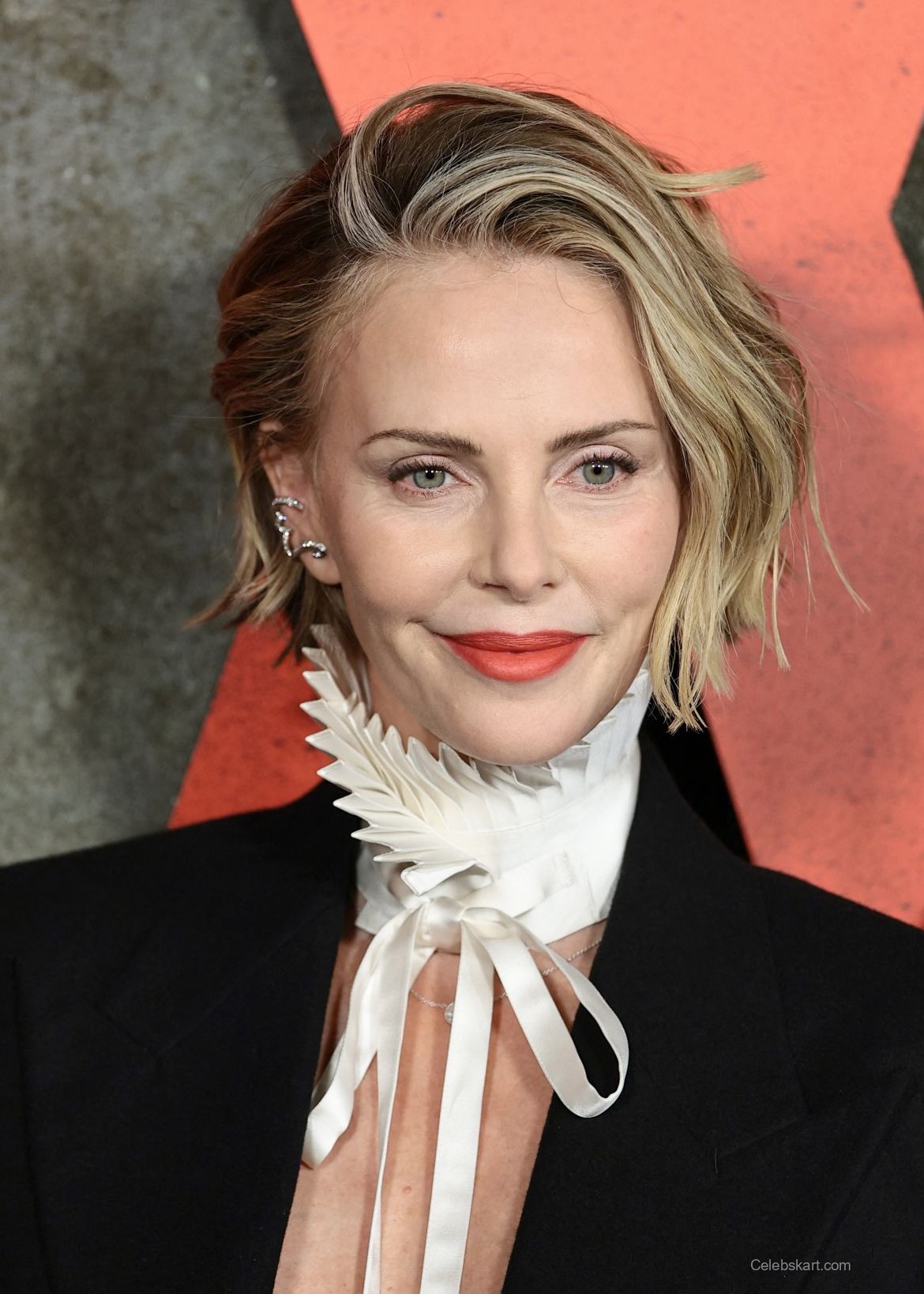 Charlize Theron attended the Apex Premiere in New York City, capturing attention with her outfit. She wore a black suit that featured a deep neckline. The ensemble was complemented by a distinctive white choker. The details of her look highlighted the unique design of the outfit. She also wore her hair in a soft, tousled style to match her attire. The combination of the black and white created a striking visual contrast.