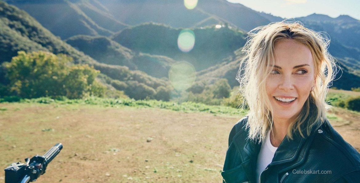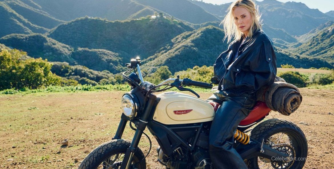 In one of the frames, Theron is seen confidently seated on a motorcycle, her hair tousled gently by the breeze. The backdrop of verdant mountains adds to the allure, serving as a striking contrast to her outfit. In another scene, she gazes thoughtfully off into the distance, her expression serene yet purposeful. The sunlight filtering through the landscape adds a soft glow to her skin, enhancing the overall composition of the photo.