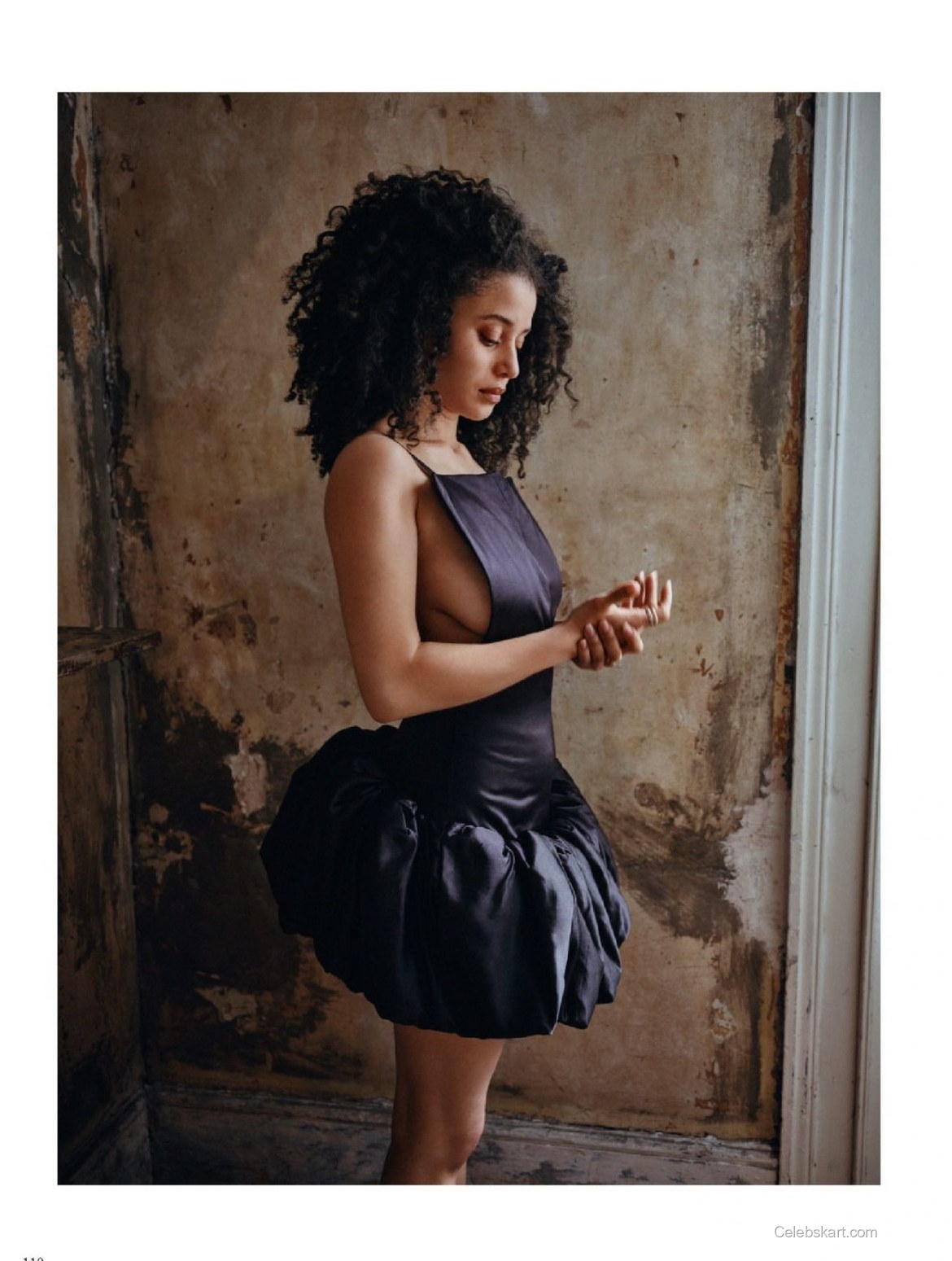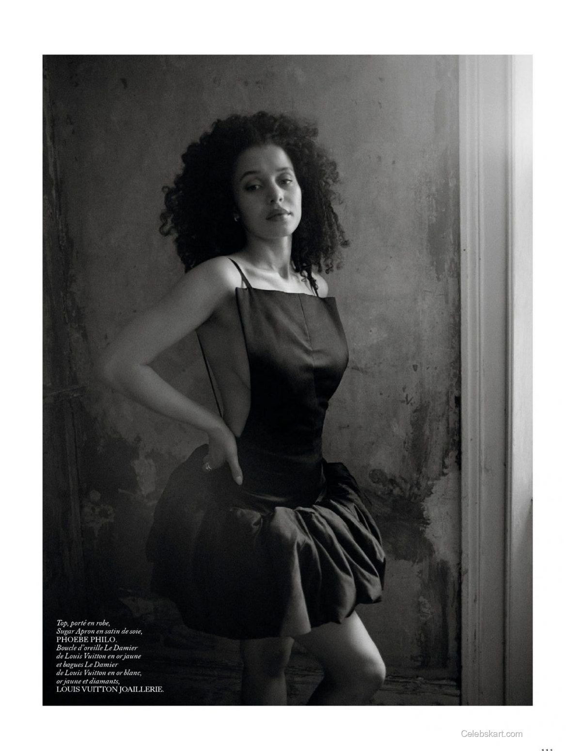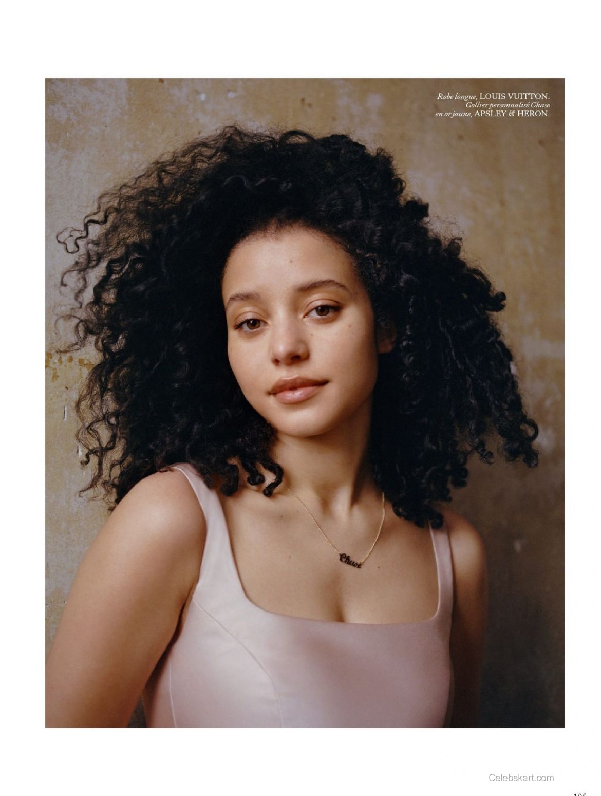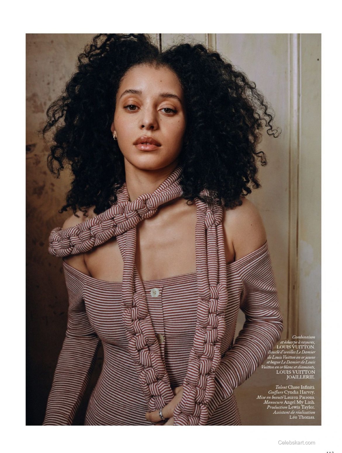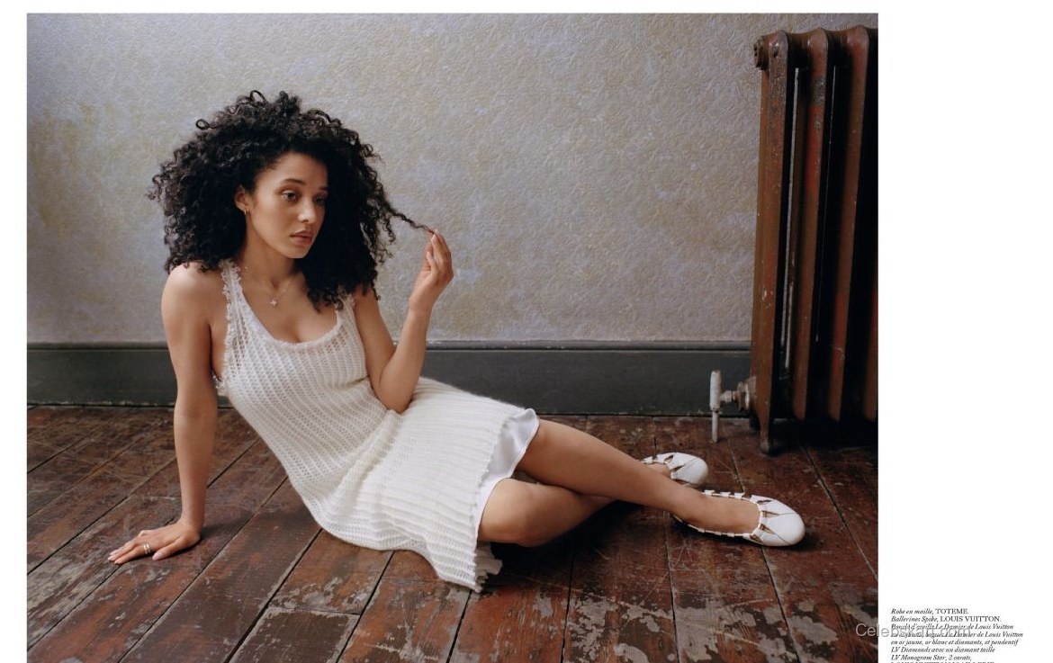 Chase is seen leaning confidently against a textured background that hints at a rustic elegance, further enhancing her fashionable attire. In one image, she’s adjusting her scarf delicately while gazing intensively at the camera, projecting sophistication and poise. The soft, natural light used in the shoot highlights her curly hair, enhancing her bold choice of accessories. In another shot, she playfully tousles her hair while seated on the ground, contributing an air of casual charm to her otherwise elegant outfit. The juxtaposition of these moments creates a dramatic narrative throughout the feature.