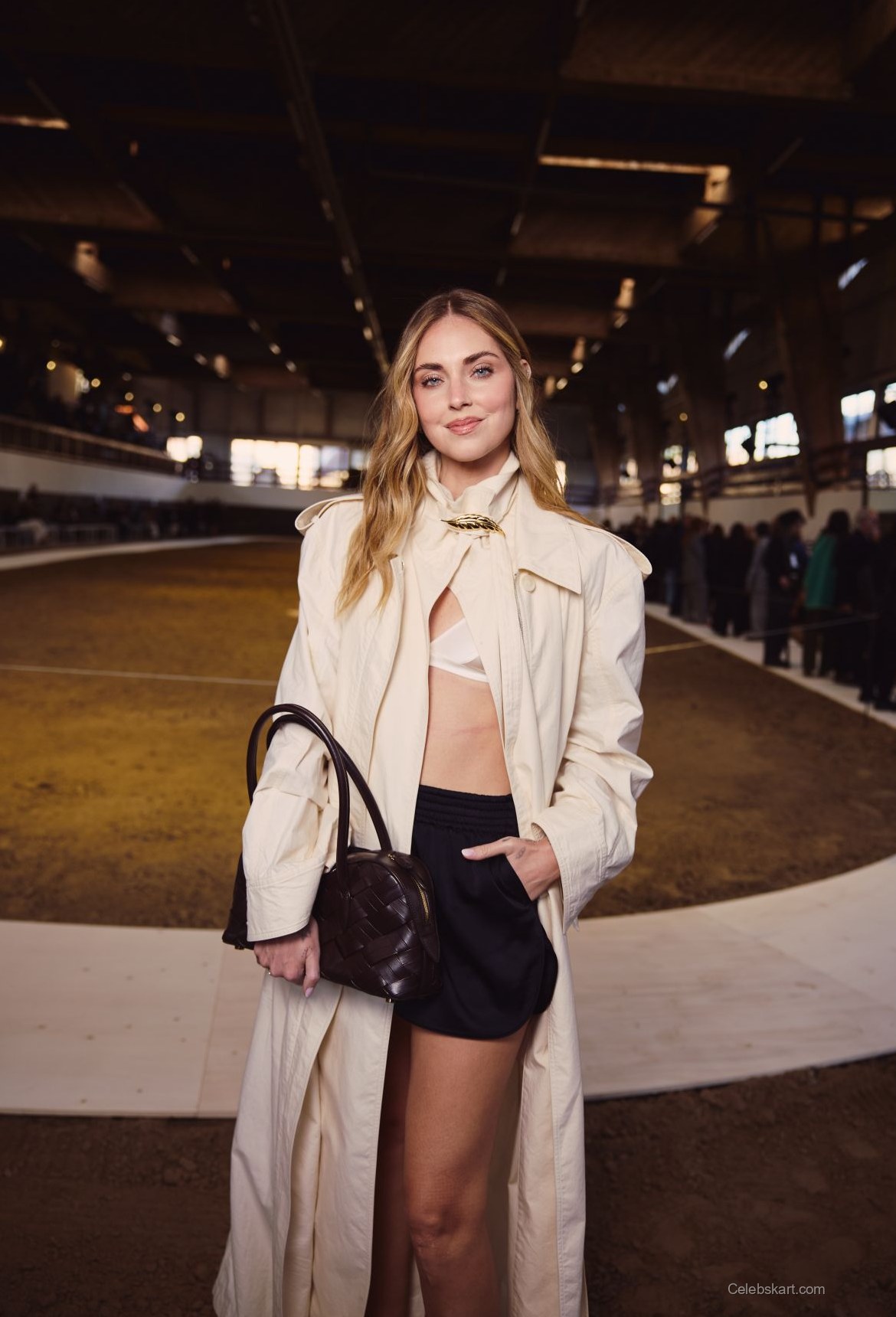 As she posed for cameras at the event, Chiara exuded confidence. With her hair cascading in soft waves, she maintained an effortless yet polished look. The background buzzed with activity, capturing the essence of Paris Fashion Week as attendees admired the innovative designs on display. Chiara's smile radiated warmth, creating an inviting atmosphere for fans and photographers alike. Notably, she held a stylish brown handbag that complemented her outfit beautifully, encapsulating her ability to balance chicness and functionality.