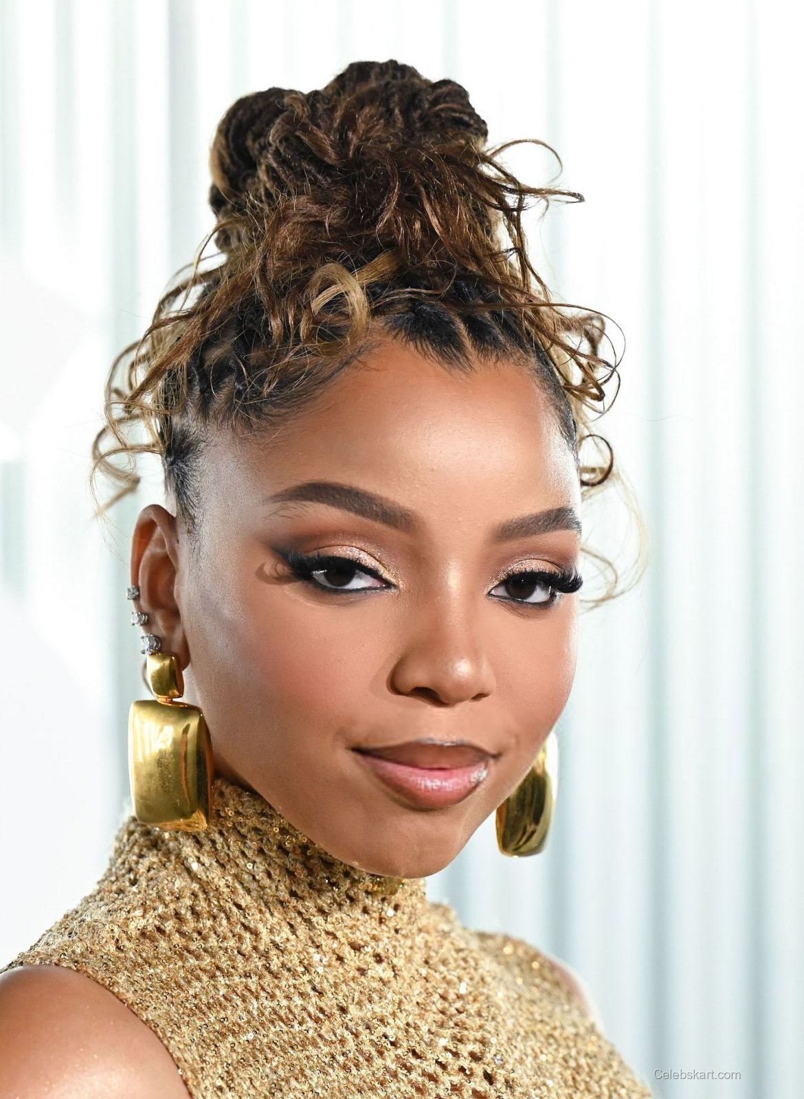 With confidence, Chloe posed for photographers, her hair styled in a trendy updo that let her stunning face take center stage. The backdrop of the event offered an elegant contrast to her golden ensemble, enhancing her radiant look. As she moved, the gown shimmered under the lights, captivating onlookers. At one moment, she adjusted her curls, showcasing the glimmer from her earrings, while in another, she clutched her clutch, accentuating her poised demeanor.