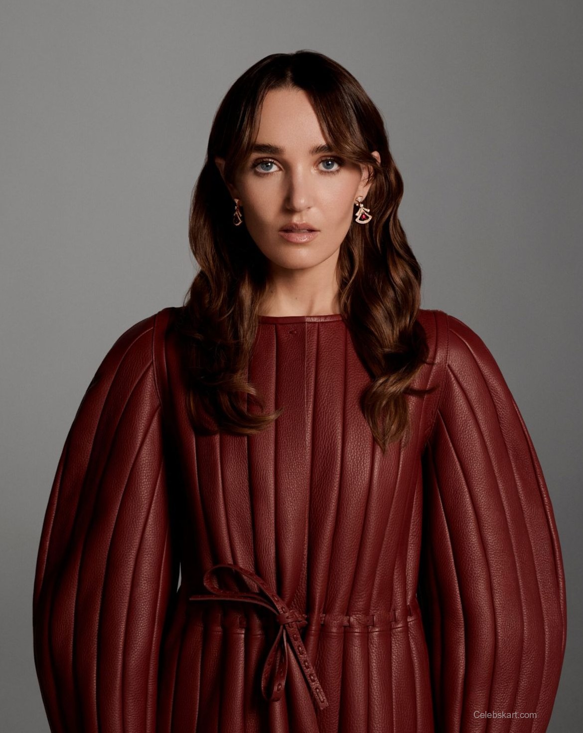 Chloe poses confidently, one hand resting on her knee while the other gently touches her face, highlighting her natural beauty. The soft waves of her hair cascade down her shoulders, framing her features elegantly. The muted background enhances her outfit, making her the focal point of the shot.