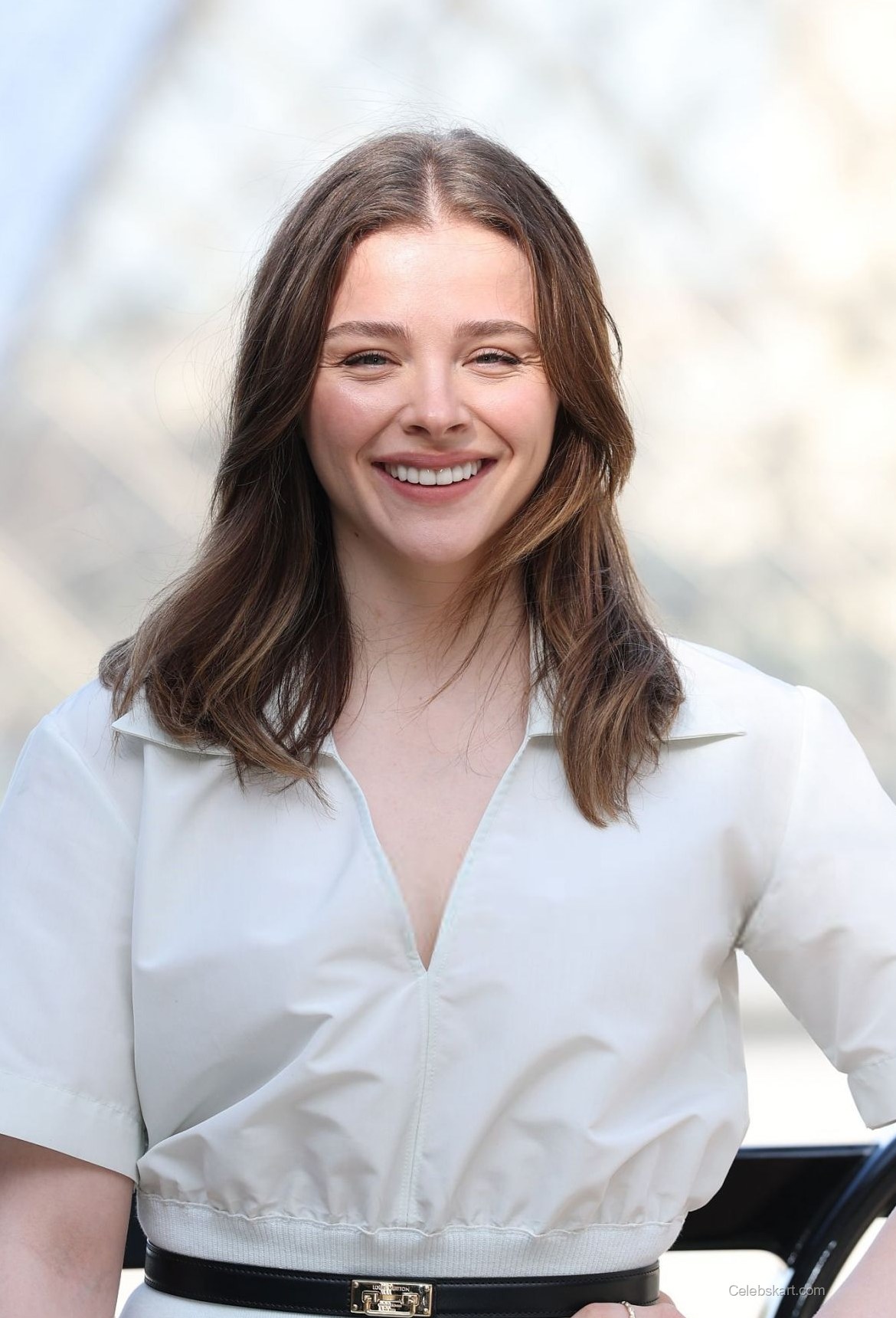 Standing confidently by the Louis Vuitton sign, Chloe exuded charisma as she posed for photographers. The backdrop of the stunning glass pyramid at the Louvre added to the allure of her appearance, creating a captivating juxtaposition of contemporary fashion against a historical landmark. Her hair fell loosely across her shoulders, framing her natural beauty and brightening her youthful complexion. To see Chloe Moretz's looks in similar settings, visit this link.
